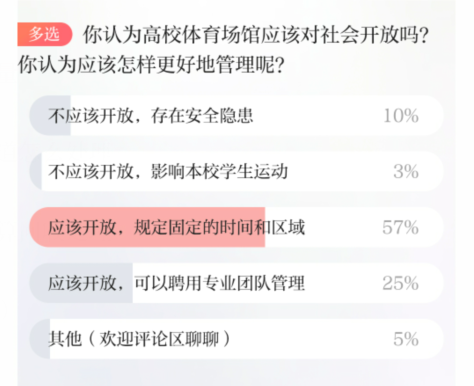 川观新闻就“高校体育场地对公众开放,为何‘说易行难’?”这个话题邀请网友展开热议,并设置投票环节,其中57%的网友认为应该开放,并规定固定的时间和区域;25%的网友认为可聘用专业团队管理;也有13%的网友担心开放会存在安全隐患或影响本校学生运动。