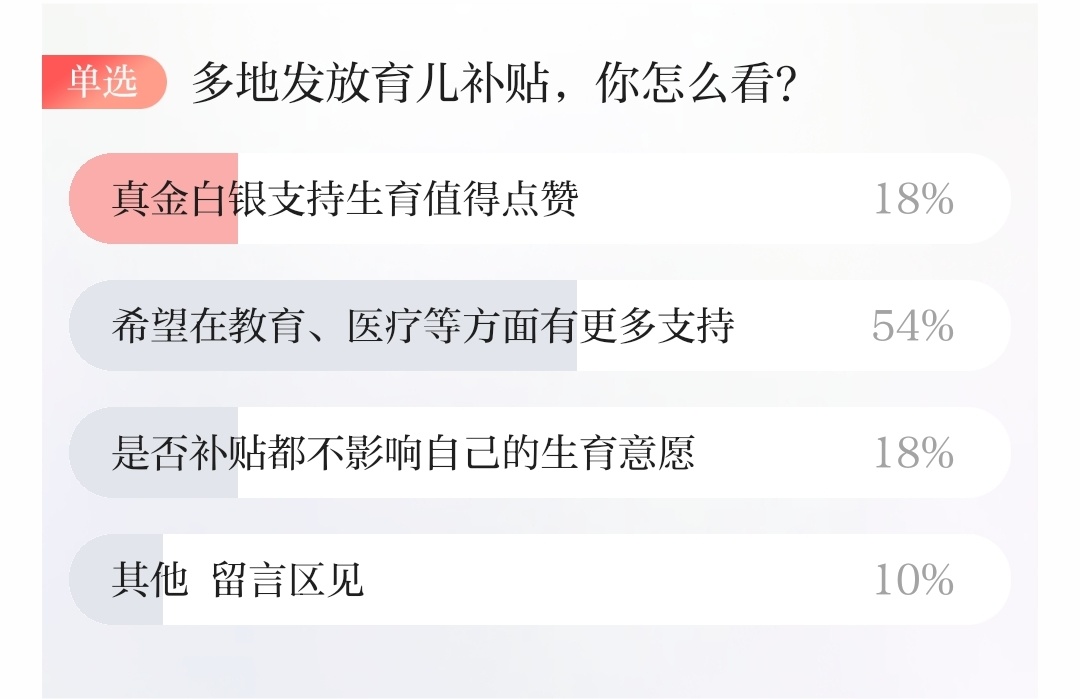 在投票环节,有54%的网友选择了“希望在教育、医疗等方面有更多支持”;18%的网友选择了“真金白银支持生育值得点赞”;18%的网友选择“是否补贴都不影响自己的生育意愿”。