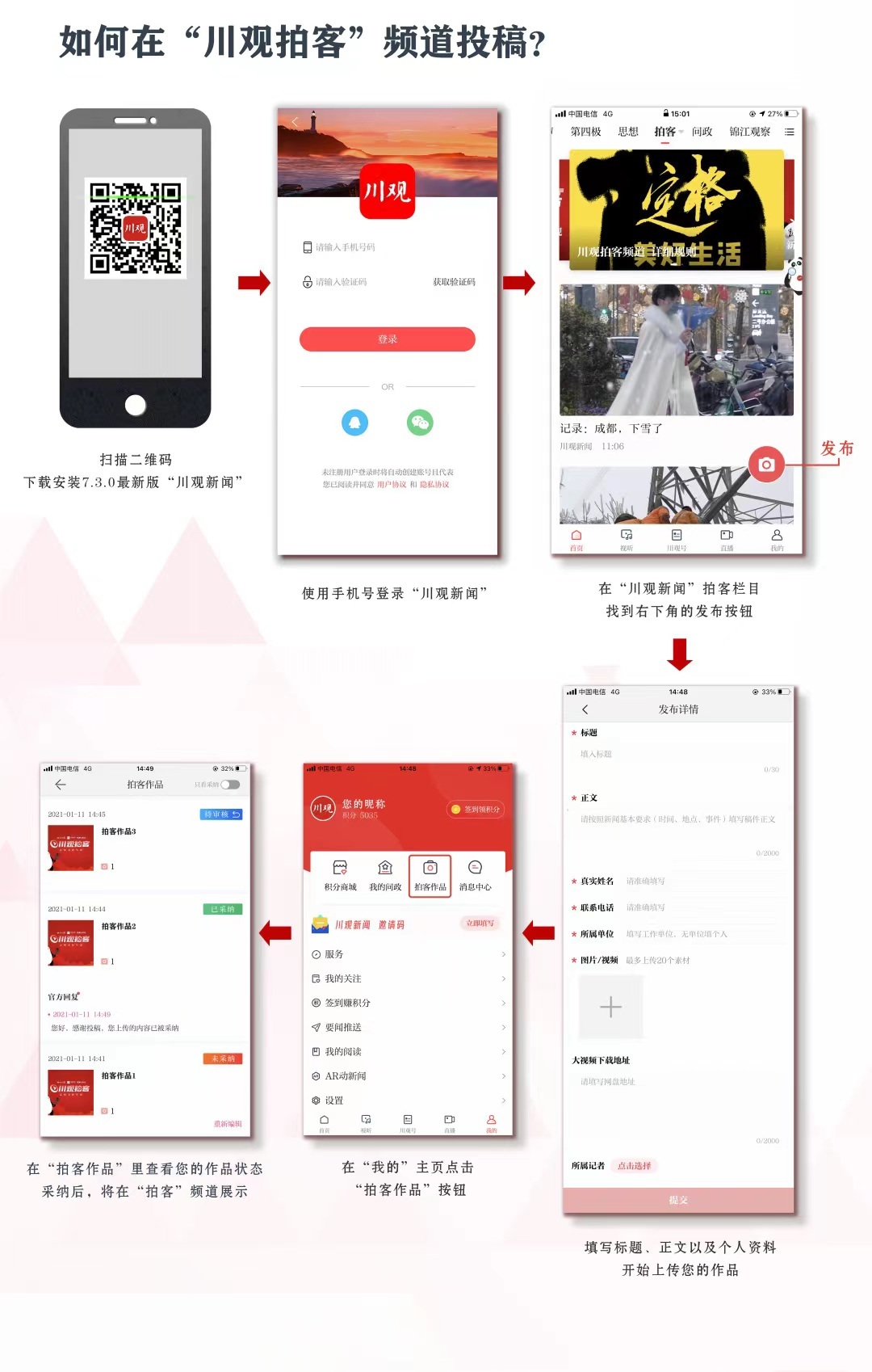本次征集作品一经采纳将在川观拍客相关专题内呈现,拍客提交的所有素材,一经川观拍客频道使用或川观拍客频道明确表示接受该素材的,这表明拍客本人授予川观拍客频道及关联方免费、非独家、可再许可的权利。(包括但不限于复制权、汇编权、信息网络传播权、改编权及制作衍生品、表演和展示的权利等)