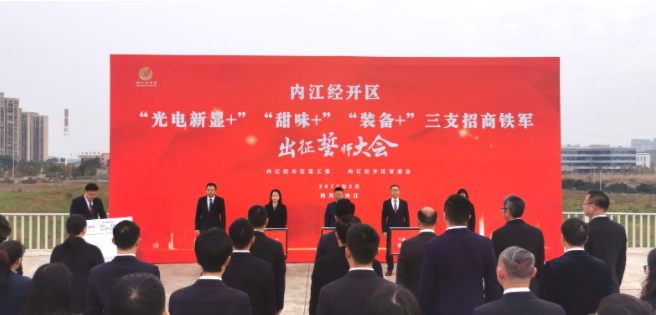 2月24日,内江经开区“光电新显+”“甜味+”“装备+”三支招商铁军出征誓师大会举行。