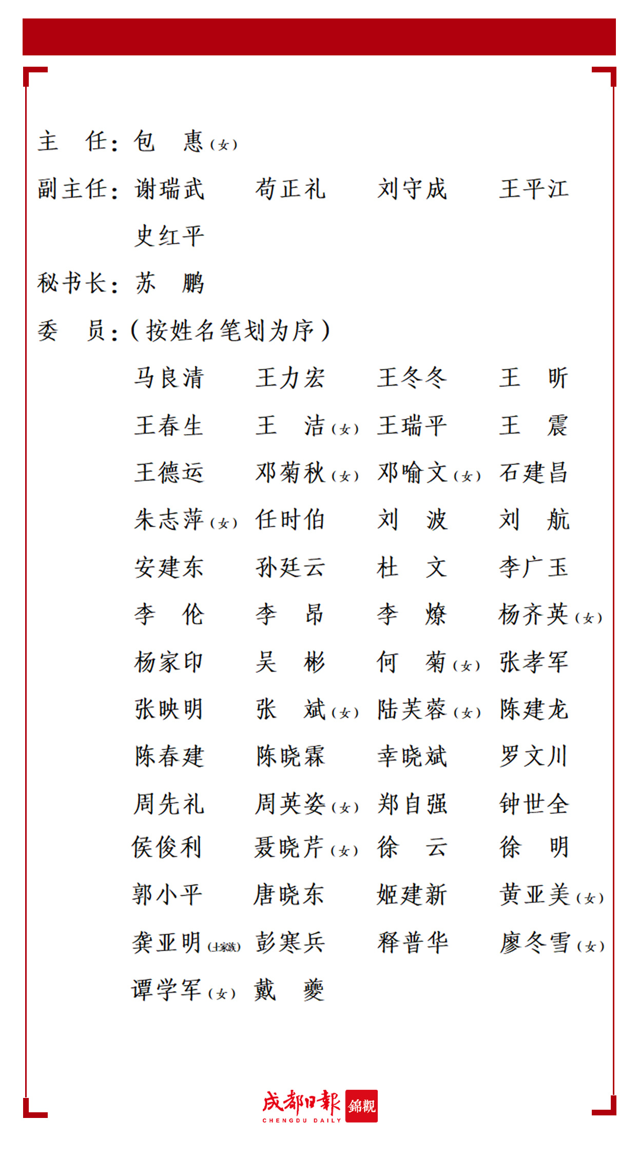 成都市第十八届人民代表大会第一次会议于2023年2月24日依法选出成都市第十八届人民代表大会常务委员会主任、副主任、秘书长、委员,名单如下: