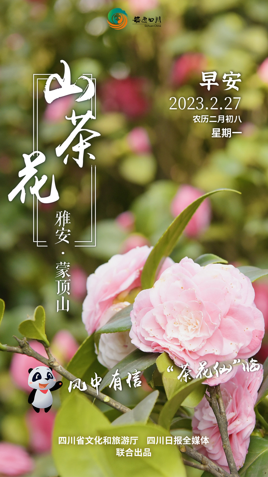 2月27日,星期一。今日安逸四川日历海报带大家登上雅安蒙顶山,听风中来信,待茶花仙临。