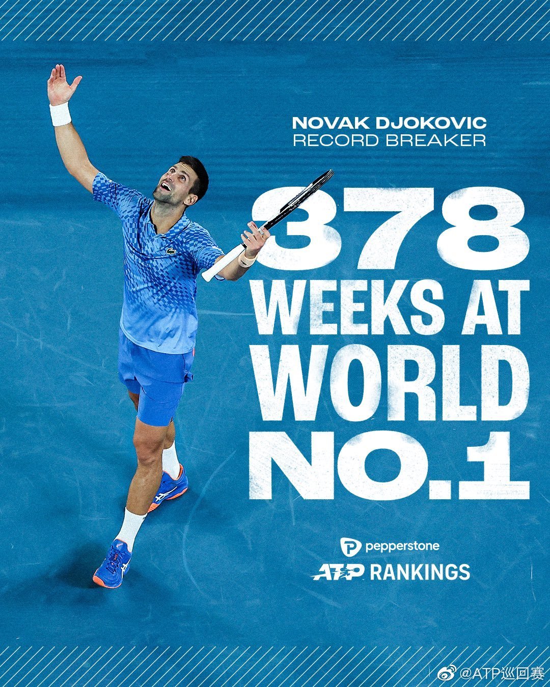 ATP官方公布了最新一期世界排名。德约科维奇继续位列第一,至此这位塞尔维亚人的世界第一周数达到378周,超越格拉芙,独居男女网坛历史第一位。自2011年7月首次登上世界第一后,德约科维奇近12年先后7次登顶。