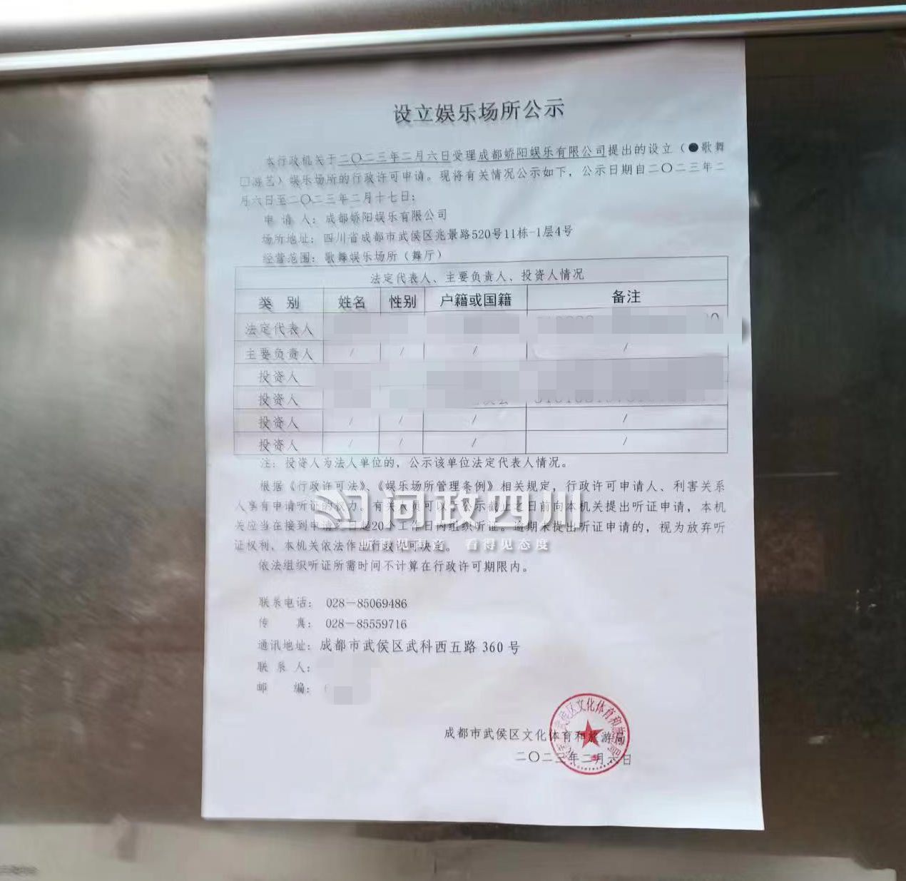 不久前,武侯区文化体育和旅游局“关于举行设立娱乐场所听证会的公告”贴到小区,居民们才知道这个夜场又要开进来了。居民们根据公司公共场所卫生许可证查询到,该场所被许可经营的内容是舞厅(卡拉OK),更是引起了大家的不满。