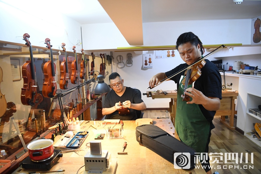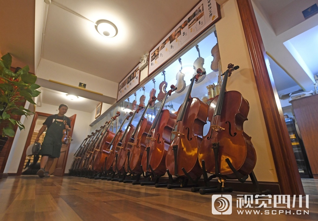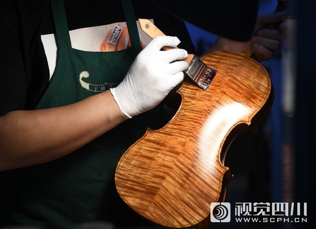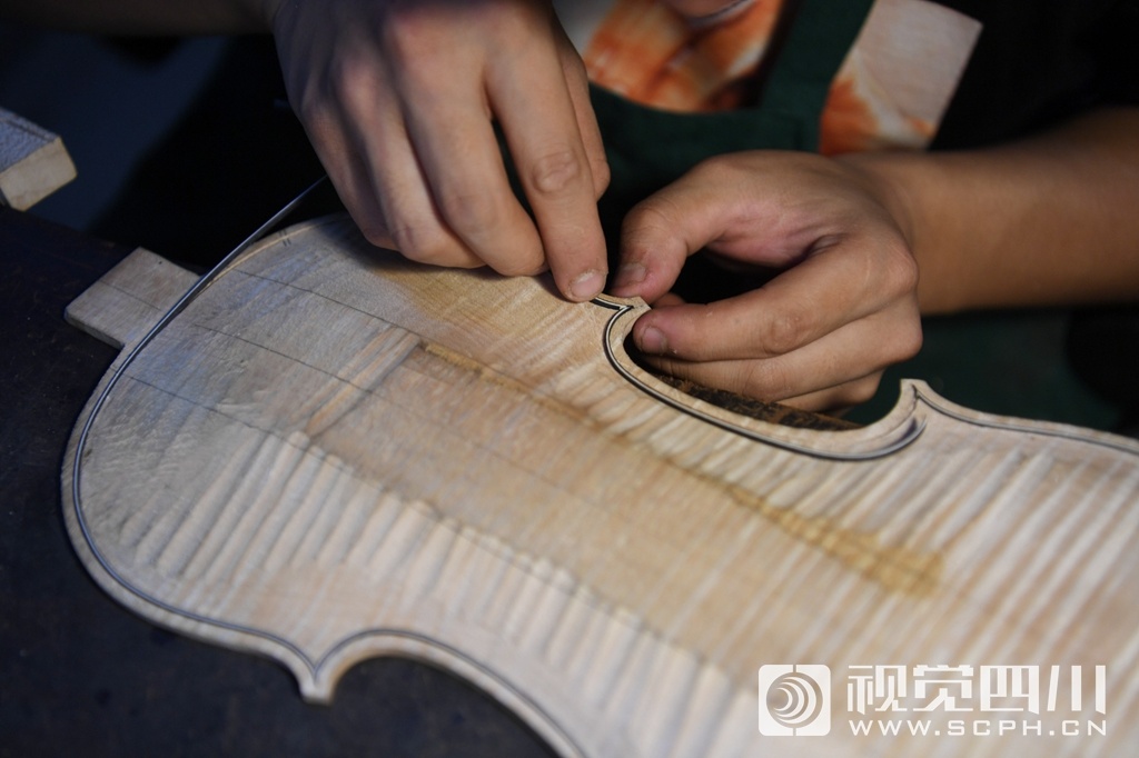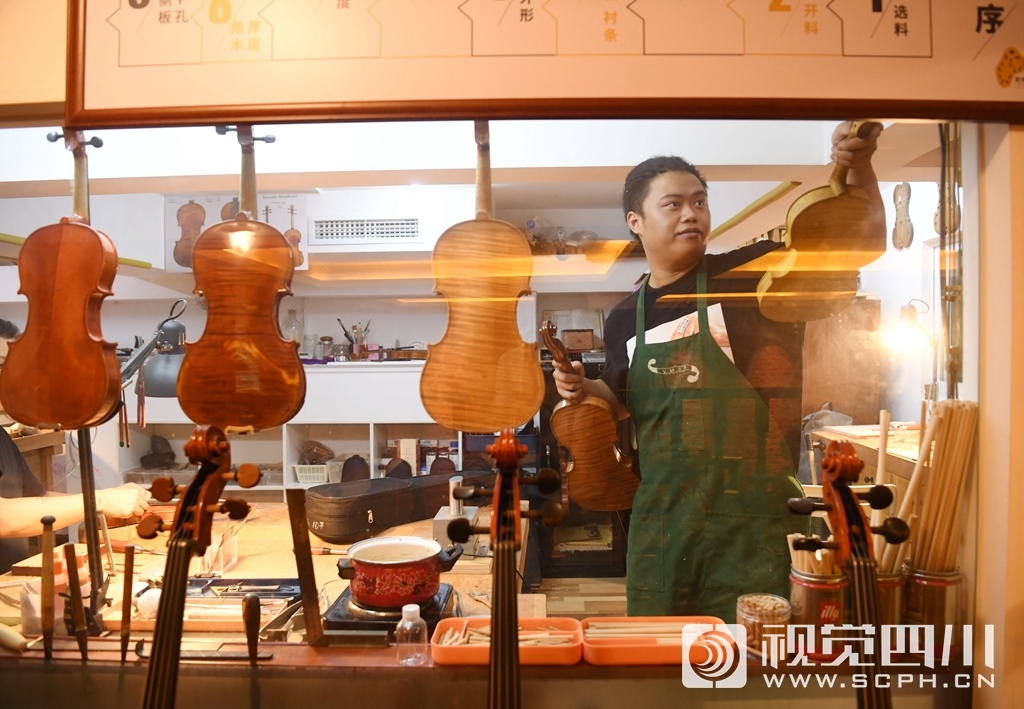 9月30日,成都市武侯区望江路街道老马路社区一家提琴展销行里,制琴师李卓霖在工作室内一丝不苟地制作着一把定制小提琴。