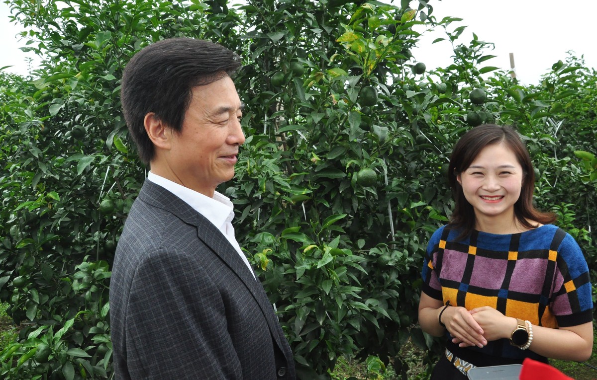 梁则栋在眉山市彭山区女青年魏姝华的种植园了解电商企业的经营情况。 摄影:王寀