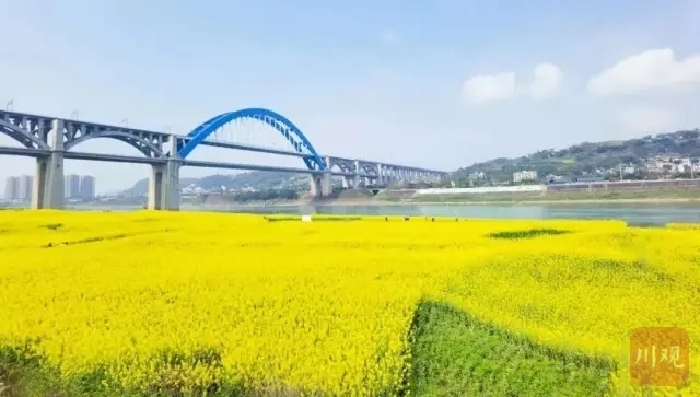 在叙州区雪滩公园,300亩油菜花海再度迎来盛花期,一片片金灿灿的油菜花“染黄”了大地。站在金沙江公铁两用桥上,整片花海尽收眼底,金沙江、金色花海、远山,像油画一般绚烂。