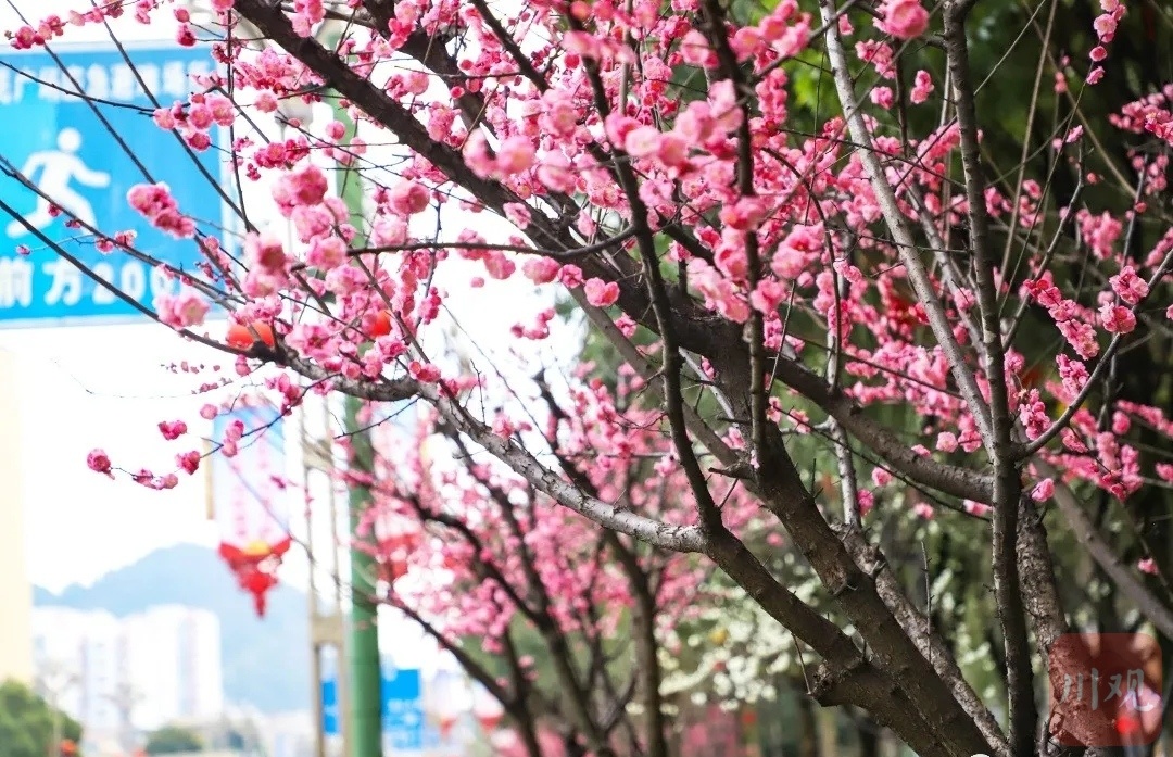 近日,在兴文光明新城的公园里、街道旁,春日限定梅花悄然开放,一树树梅花灿若云锦,成为一道靓丽的风景。从路旁走过,微风徐徐、花香四溢,吸引市民驻足观赏。