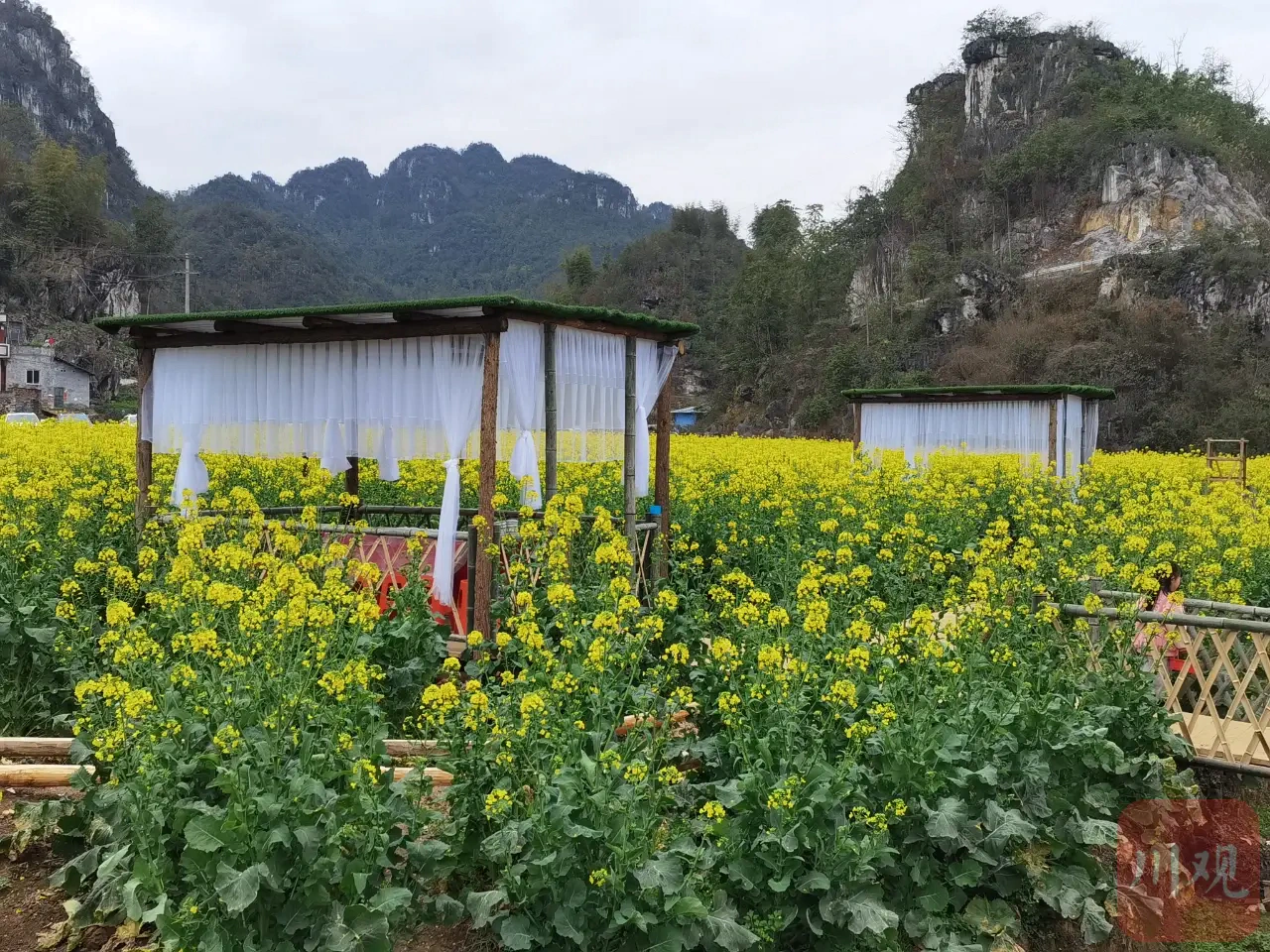 筠连县古楼峰丛大洞湾农场的油菜花已经开得格外灿烂,远远望去像一片金色的海洋。在这里,你可以在花海里徜徉,体验草莓采摘、围炉煮茶、户外烧烤等。
