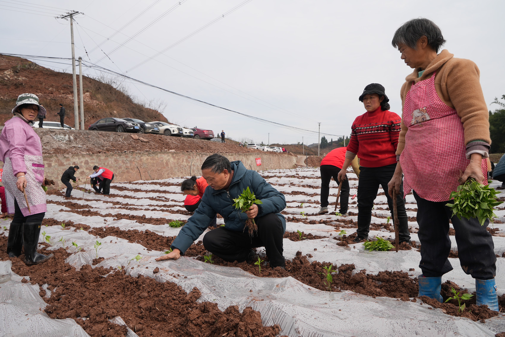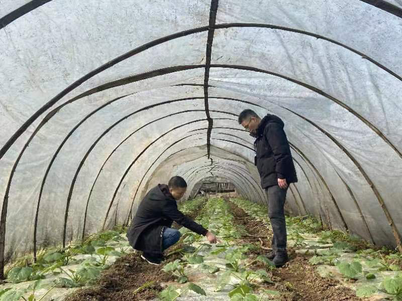 来复镇太平村里,蔬菜种植大户杨净正带领着村民给刚种下的海椒盖薄膜。“早上起来就能看到薄膜上结起一层水珠,起到抗旱保湿的作用。”杨净说。