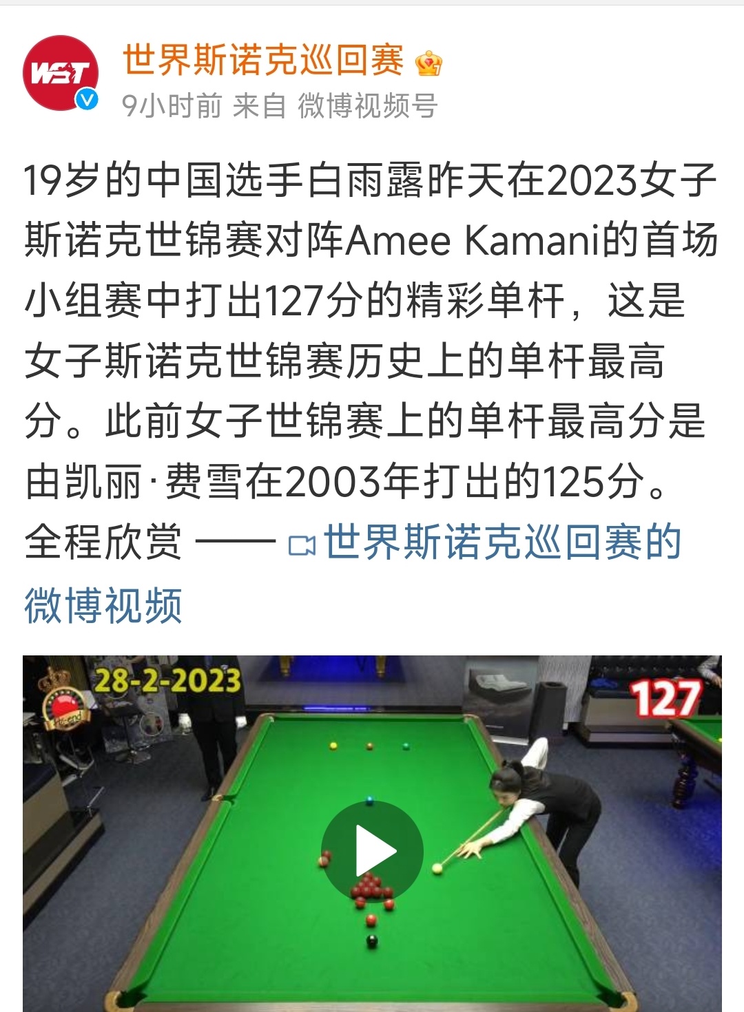 2023世界女子斯诺克锦标赛在泰国曼谷进行。19岁的中国女球手白雨露打出了127分的高分,打破了女子斯诺克世锦赛的单杆最高分纪录。白雨露顺利晋级第二轮。这是白雨露第一次在女子巡回赛上亮相,她正向着更好成绩发起冲刺。