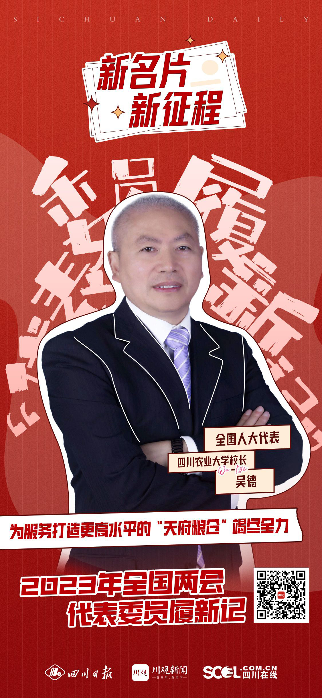 近段时间,吴德格外忙碌,一边忙着深入乡村振兴一线调研,一边忙着新学期的开学工作。“作为来自农业高校的全国人大代表,身处农业科研和管理一线,我深深感到责任重大,我要努力为国家粮食安全和乡村振兴拿出‘川农方案’,让中国碗装中国粮、装优质中国好粮。”