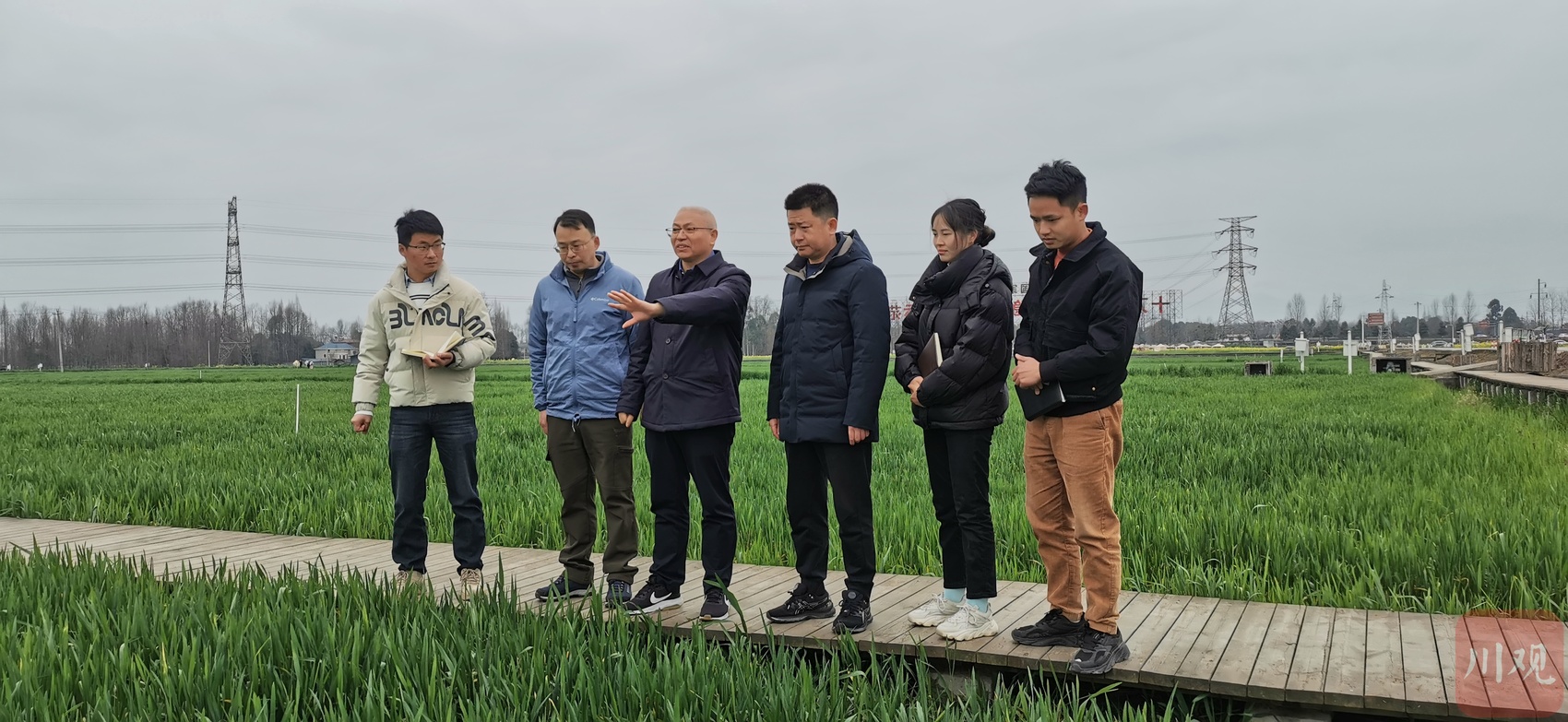 吴德(左3)在崇州十万亩粮油基地调研学校小麦高产示范片情况。