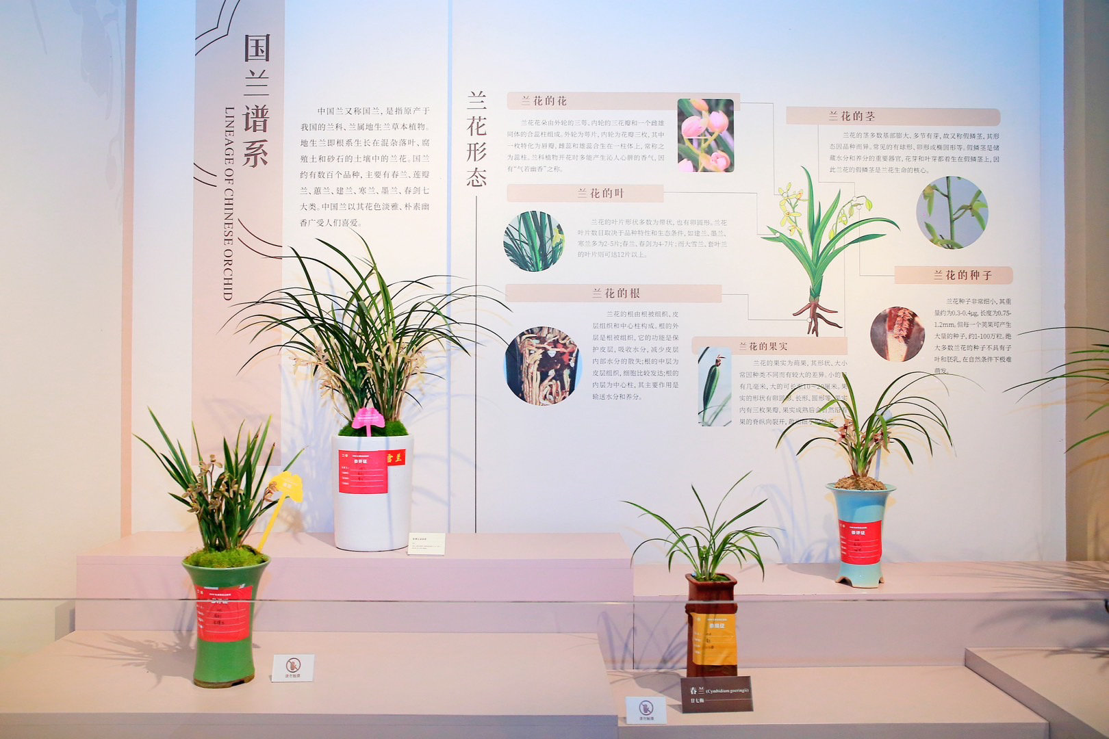 展览分为室内兰花文化展区、室外兰花盆景展区和回廊兰花艺术展区三个展区。其中,室内兰花文化展区分为兰花科普知识、兰花人文精神、草堂兰园与朱德兰三部分;室外兰花盆景展区重点打造了八处形态各异的兰花景观;回廊兰花艺术展区以兰花实物和历代名家的兰花主题书画作品相结合的形式,展示文人雅士书画艺术作品。