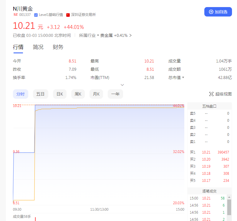3月3日,四川容大黄金股份有限公司(简称“四川黄金”)在深圳证券交易所主板上市,发行价格7.09元/股,发行市盈率为22.98倍。截至收盘,四川黄金股价报10.21元/股,首日涨幅为44.01%,总市值42.88亿元。