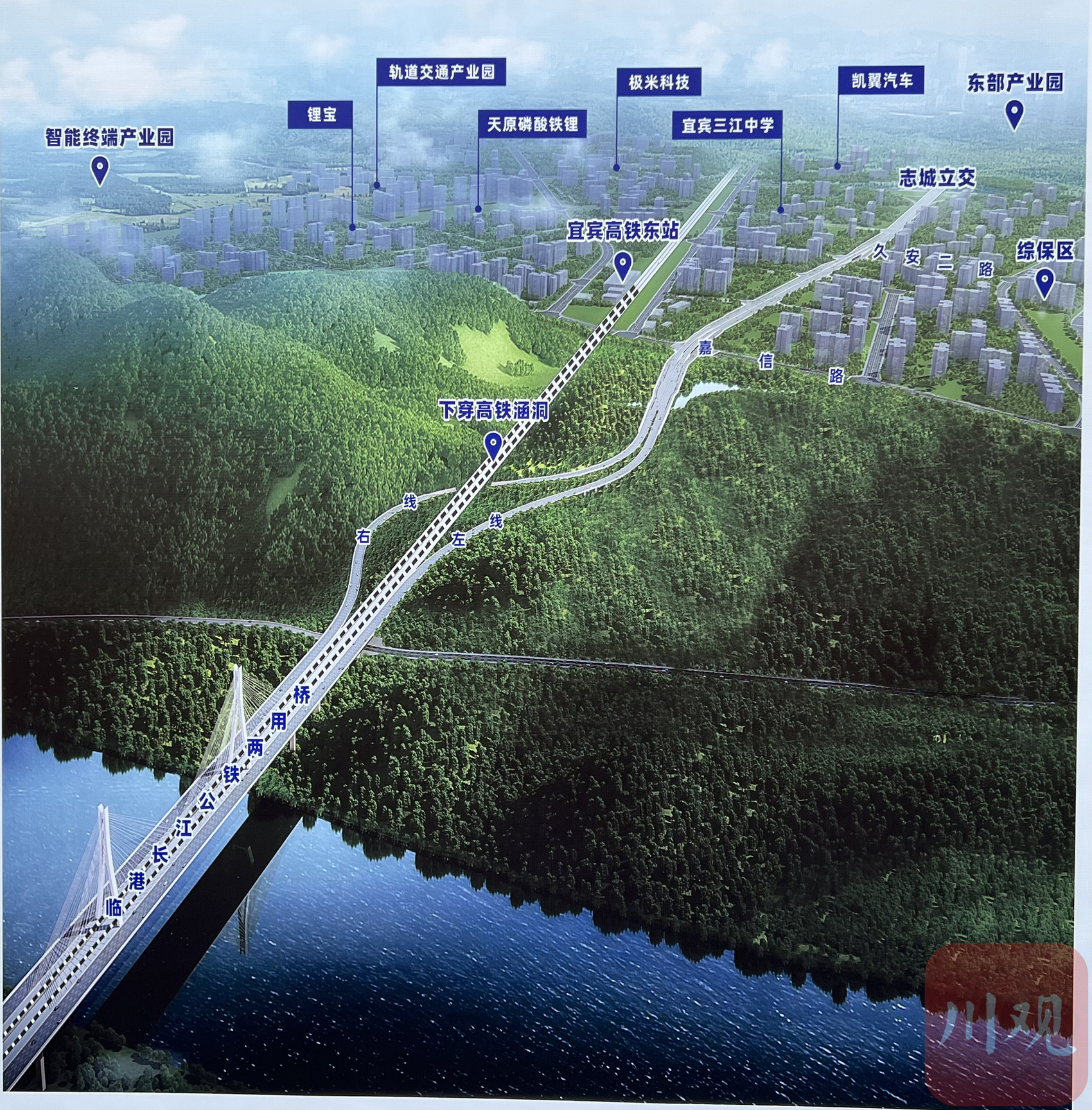 宜宾东站为两条350公里时速的渝昆高铁和川南城际铁路自宜段汇合站点,设计站房规模约1万平方米、日旅客发送量1万人次,目前已封顶,今年底前将投用,届时三江新区将进入成都和重庆“一小时经济圈”。该高铁站的投用也将筑牢三江新区水陆空铁多式联运的物流优势。