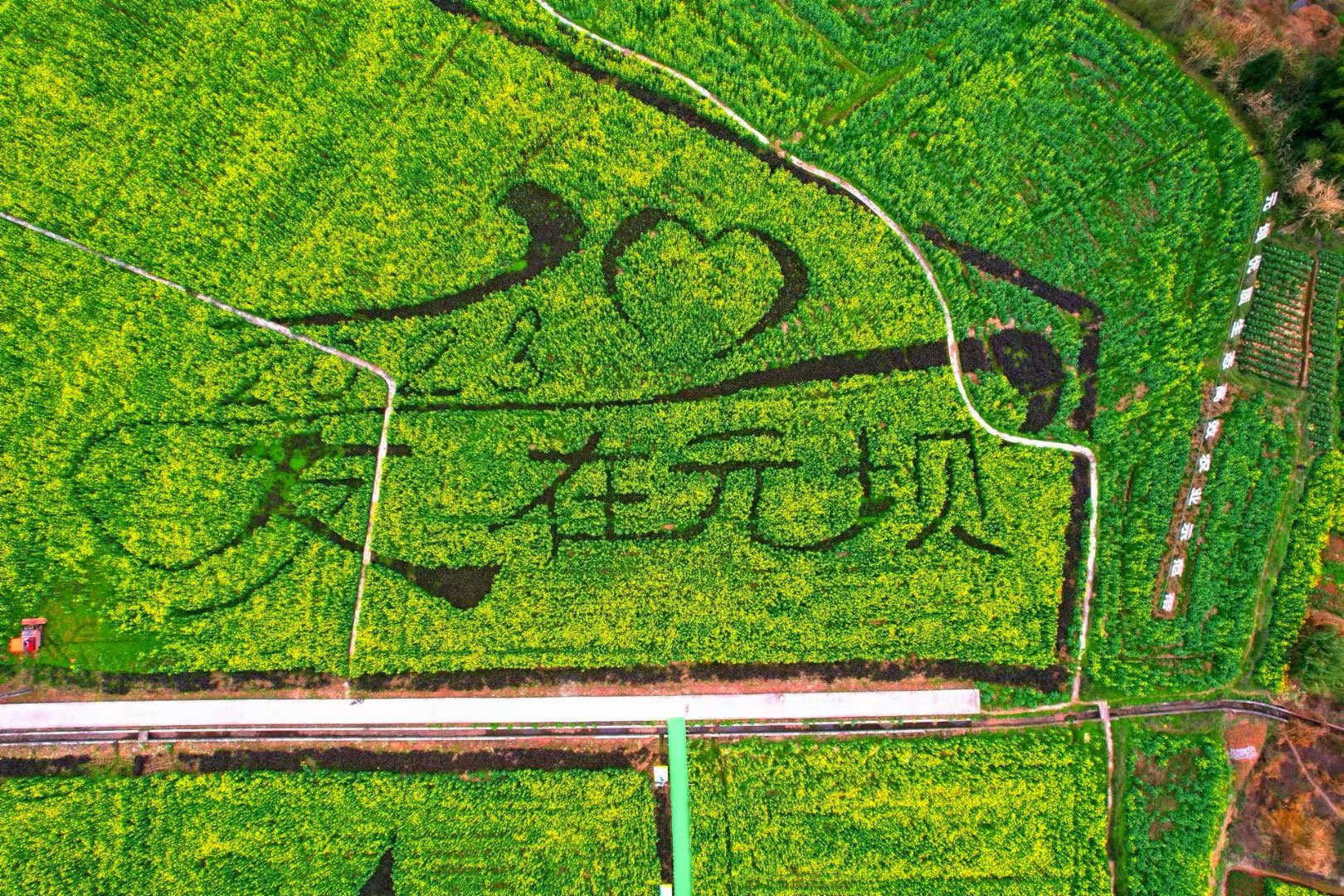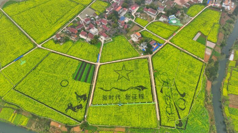 随着2023年资阳大足双城农文旅联动暨第二届安岳元坝油菜花赏花活动的启动,安粮坝油菜花海的巨幅画作也正式亮相。从高空俯瞰,花海中出现了“黑兔望月”“新时代、新征程”“爱在元坝”等图案。元坝镇党委书记陈永金介绍,这是利用了油菜花的品种、花期、颜色差异种植而成的。“我们当地的专业合作社,在播种的时候就对位置、图案进行了设计和规划,最终呈现出来了这样的画面。”
