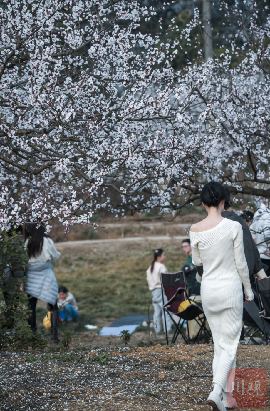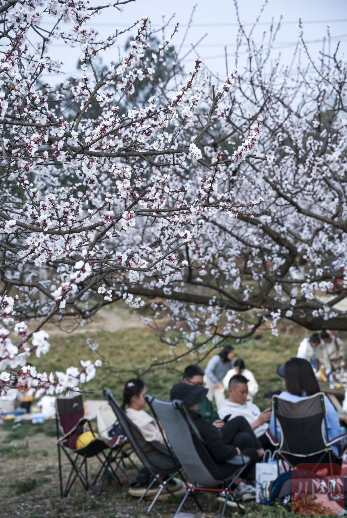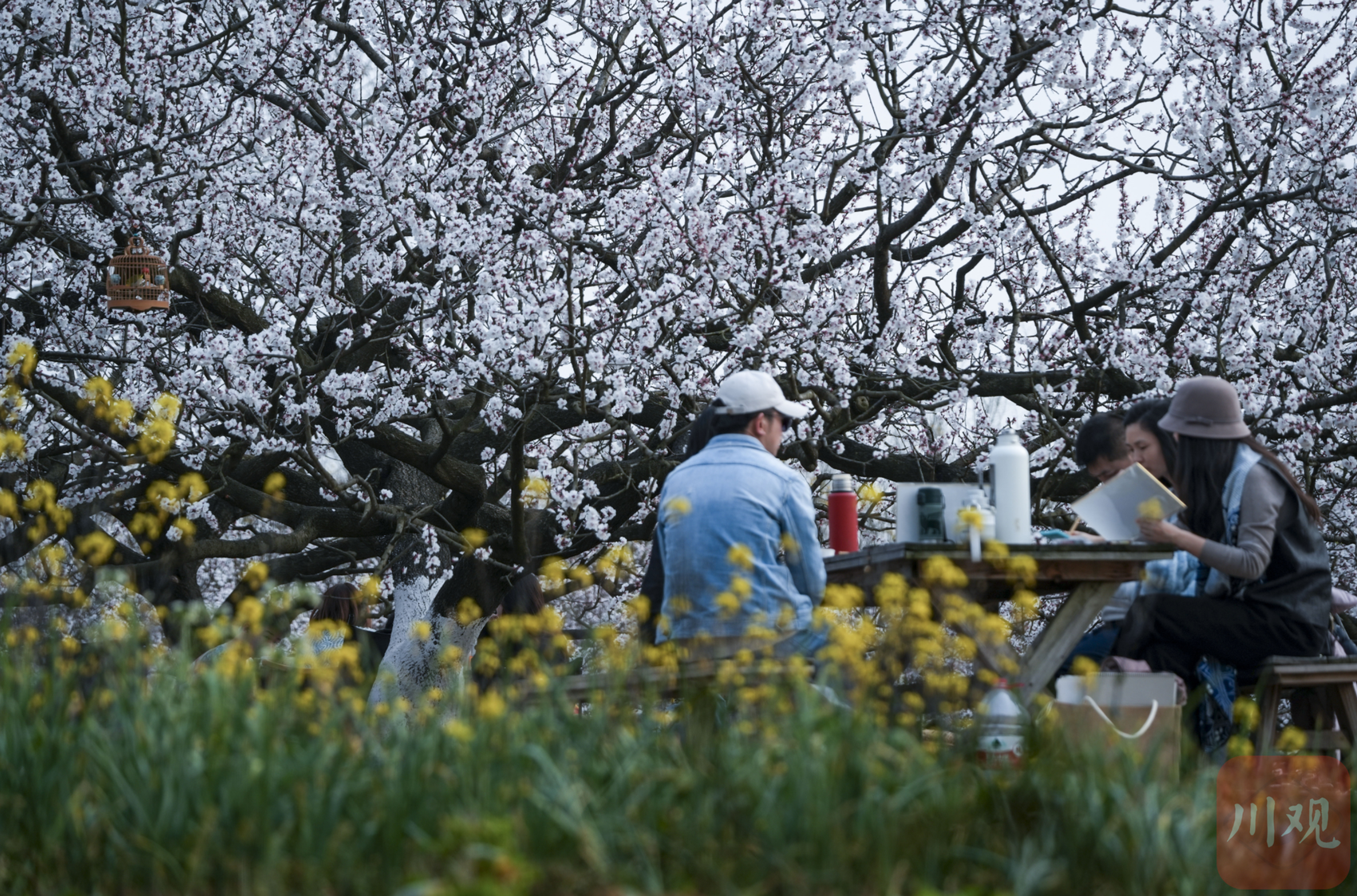 3月4日,成都市双流区胜利镇白塔村的长坂坡杏园里,雪白的杏花在春日和煦的阳光照耀下,开得正艳。市民在树下品茗休闲,享受春天的暖阳。