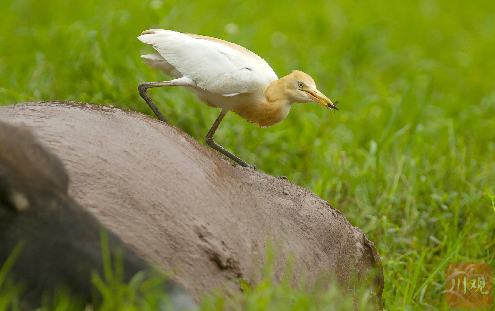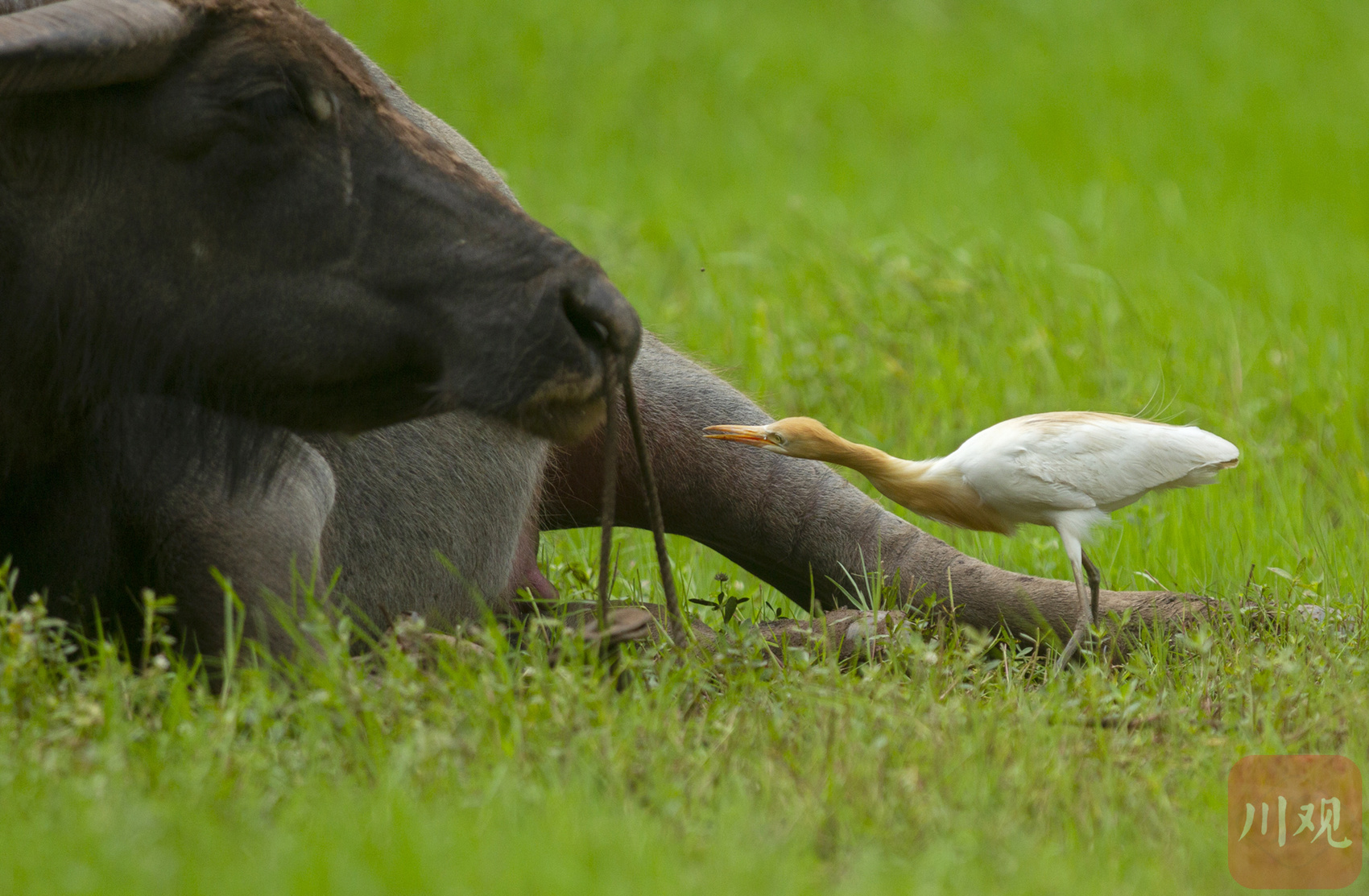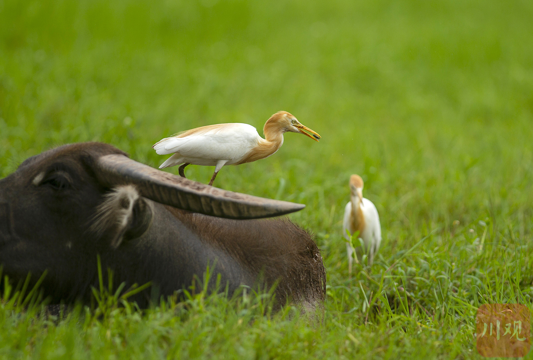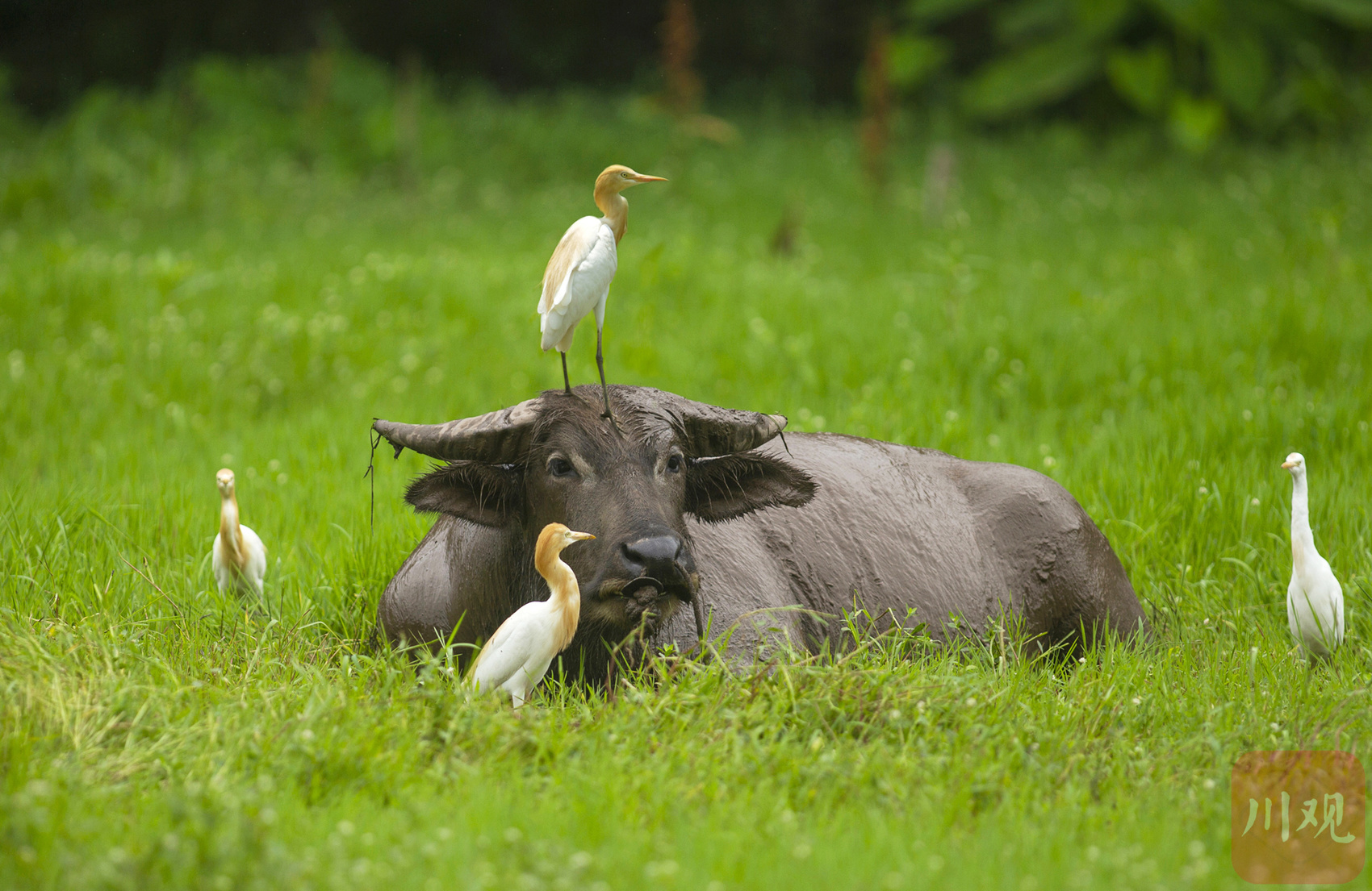 在内江市东兴区团结水库边,有一片青草地,老罗家的水牛就在草地吃草,从树上三三两两地飞来牛背鹭,跟在牛左右,水草中惊起的小虫和牛身上的牛虻都逃不过鹭的眼睛。牛吃饱了,在水凼里打滚,抹一身泥防止蚊虫叮咬,这时牛背鹭便趁机跳到牛身上,啄食牛虻。