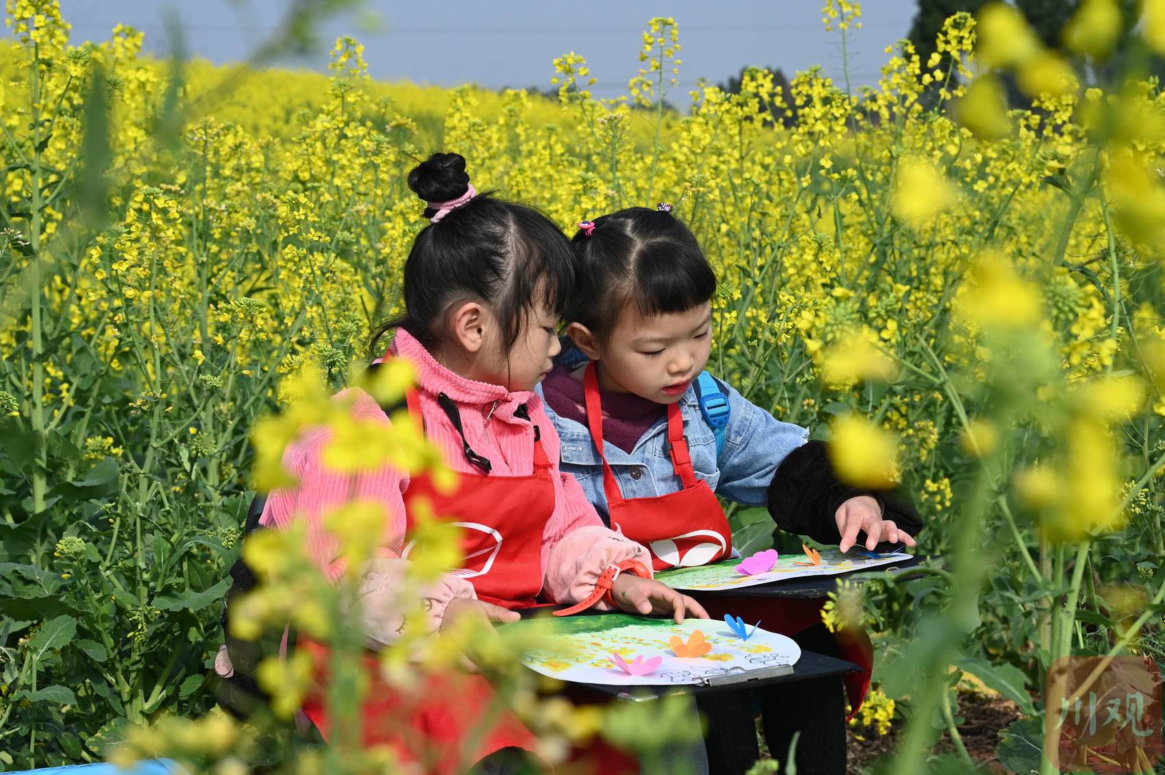 2月26日,内江市东兴区双才镇玉皇观村,小学生们在油菜花田间画画。
