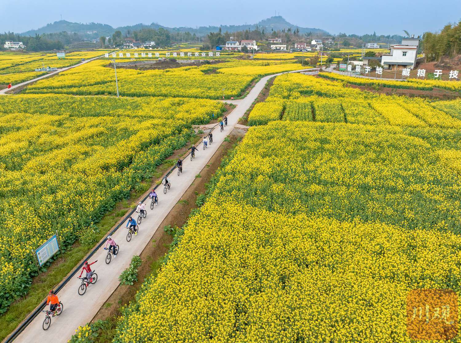 近日,宜宾市江安特色粮油现代农业园区核心区近万亩油菜花竞相绽放,吸引了众多自行车骑行爱好者前往骑行赏春。
