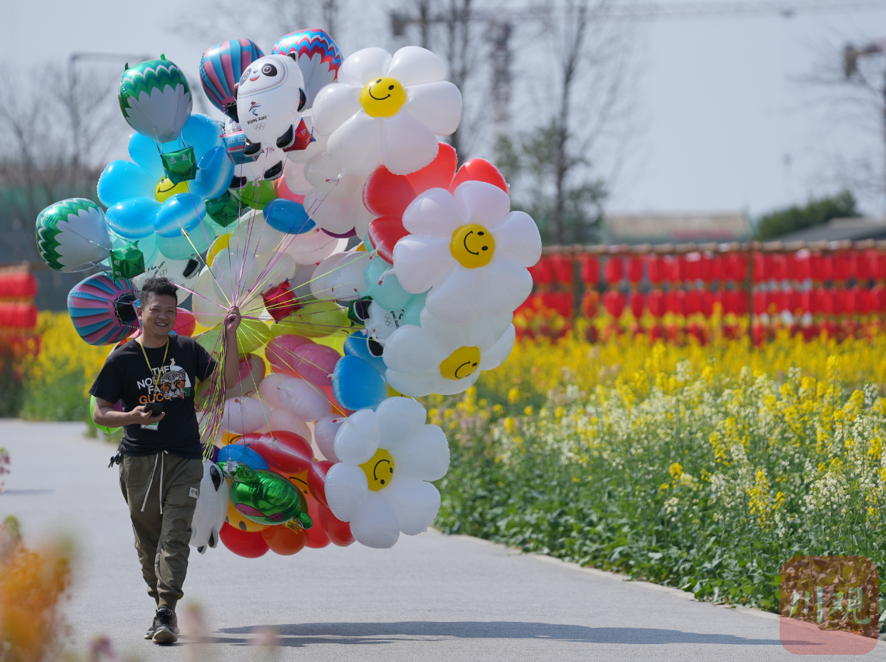 农博园油菜花开放,引得不少市民和游客前来,农博园里卖气球的工作人员生意不错。