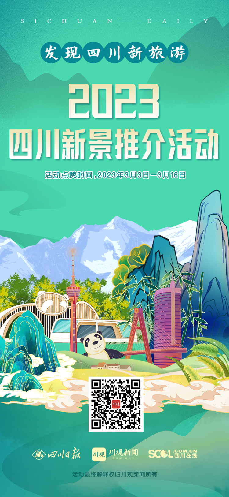 1、“发现四川新旅游·2023年四川新景推介活动”展播网络人气点赞仅在川观新闻客户端进行,用户参与活动需打开川观新闻客户端;