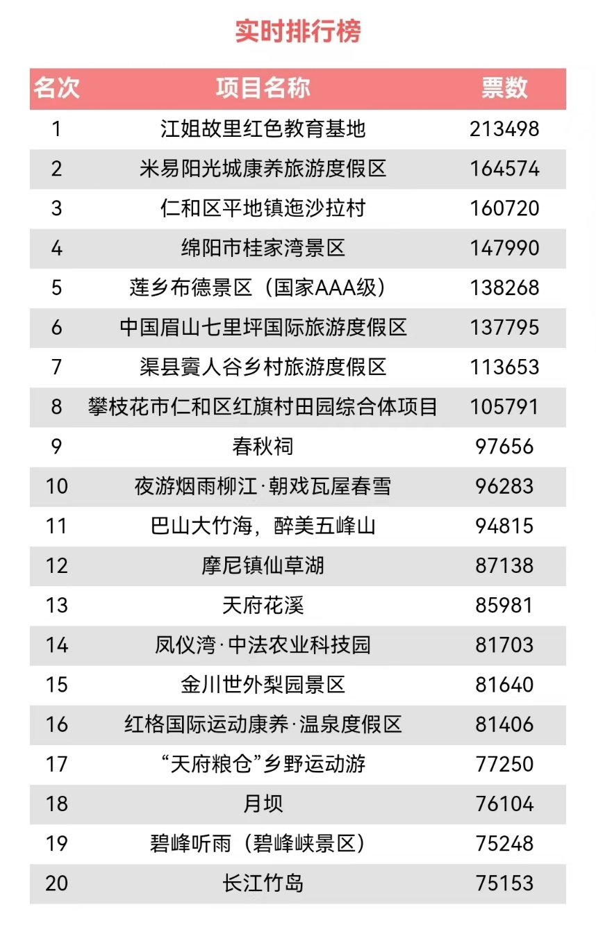 在温暖的春日,是去峨眉山登高,是去攀西阳光游,还是去体验乡村游?网友们纷纷为心目中的“四川新旅游”投上自己宝贵的一票。截至3月10日18时,点赞榜排名第一的江姐故里红色教育基地,点赞量已突破20万。