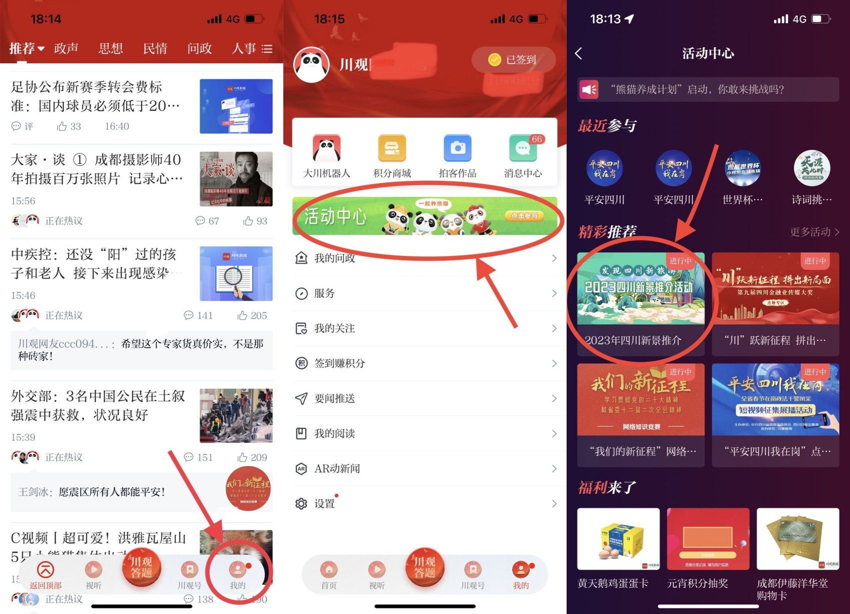 【第二步】在川观新闻首页,“我的”版块,点击“活动中心”,找到“2023年四川新景推介”活动图片,点击参与活动。