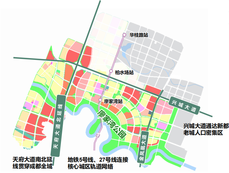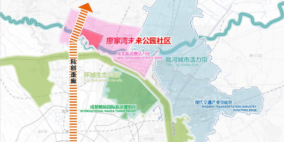 在区位上,廖家湾更显门户优势。廖家湾是成都环城生态公园与天府大道中轴线北部交汇点,“环轴相交”南部交汇点在环球中心。同时,随着成都火车北站启动改造工程,成渝铁路中线始发站回归,北门有望再次成为成渝客流中心。与火车北站相隔18公里,廖家湾将与蓉北商圈、凤凰山片区一起,撑起成都北部的城市新空间。地铁5号线、27号线直达,天府大道、市域铁路S11线等交通赋能,都将廖家湾与主城区的通勤距离快速拉近。