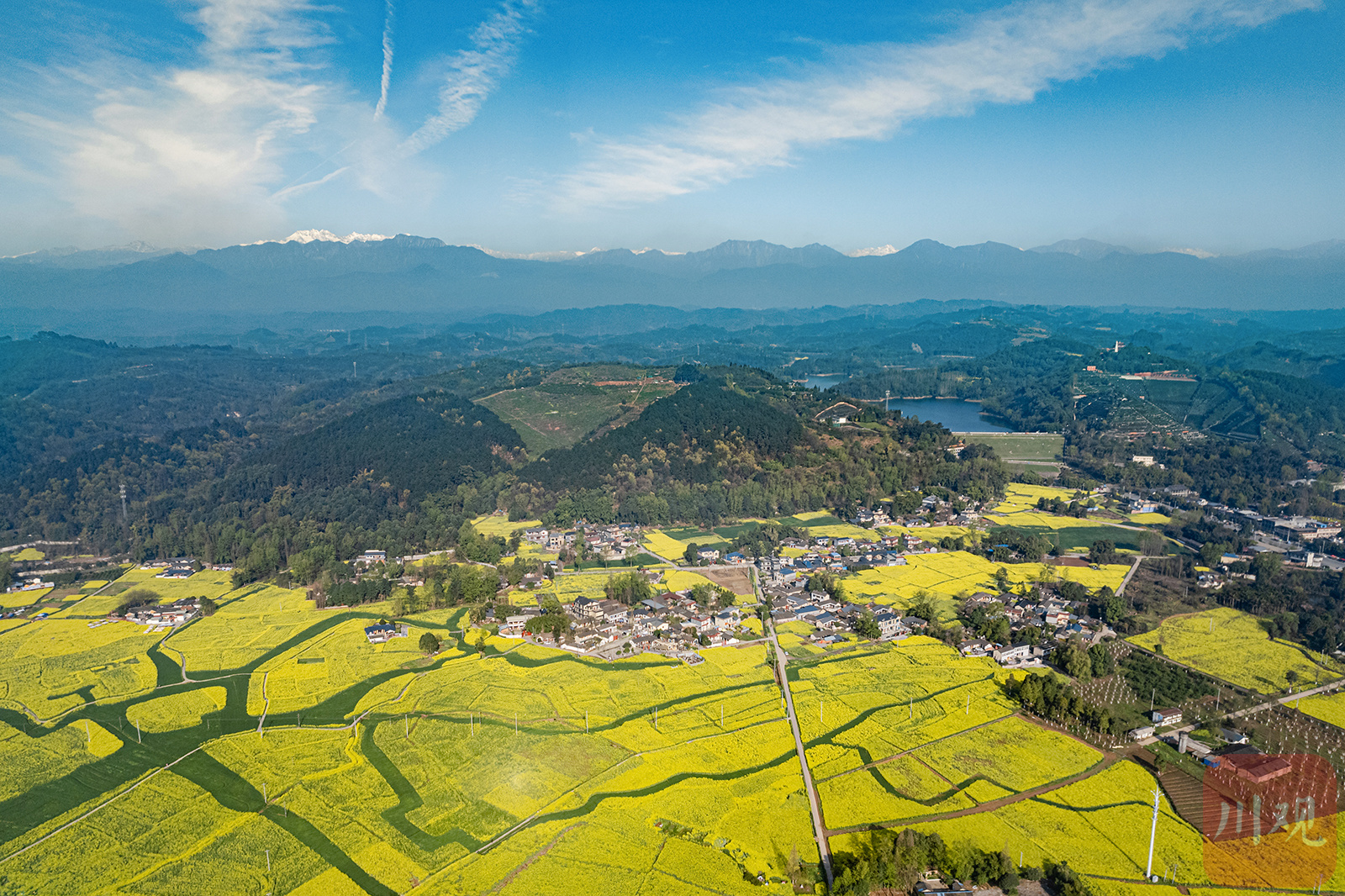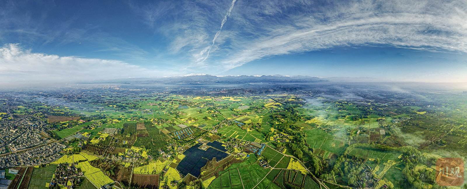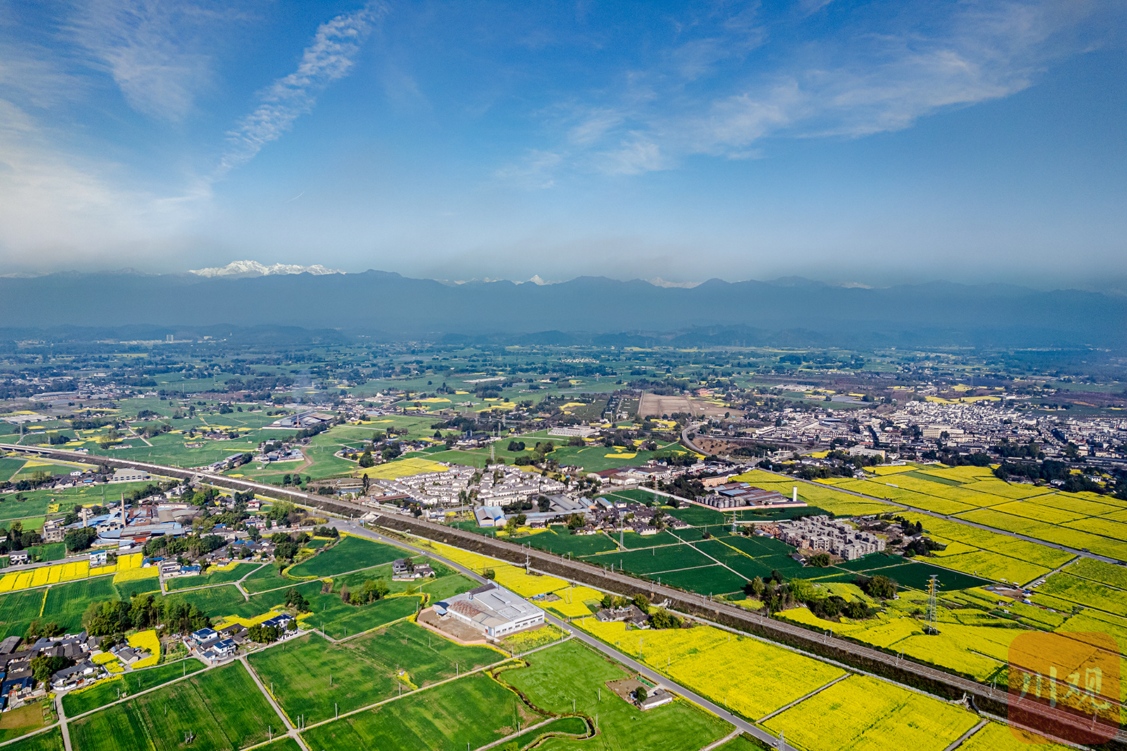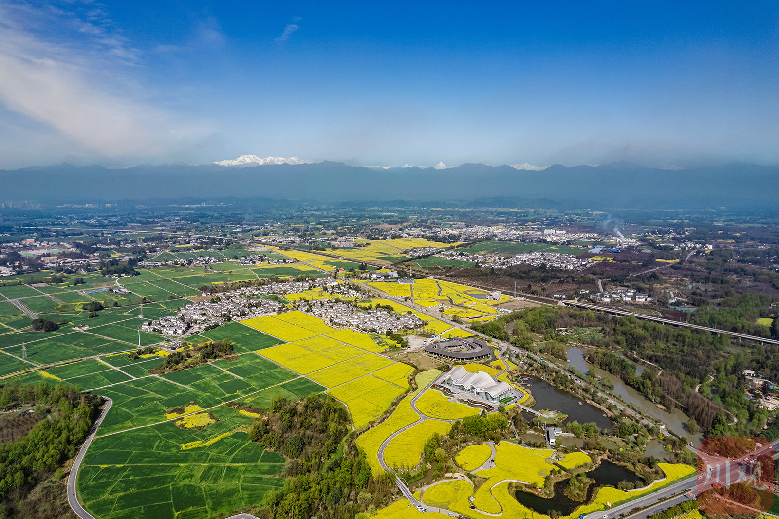 2023年3月13日,雨过天晴,在崇州竹艺村、五星村,远处的幺妹峰、大雪塘肉眼清晰可见。大地春暖花开,在雪山的映衬下,一片欣欣向荣的景象。