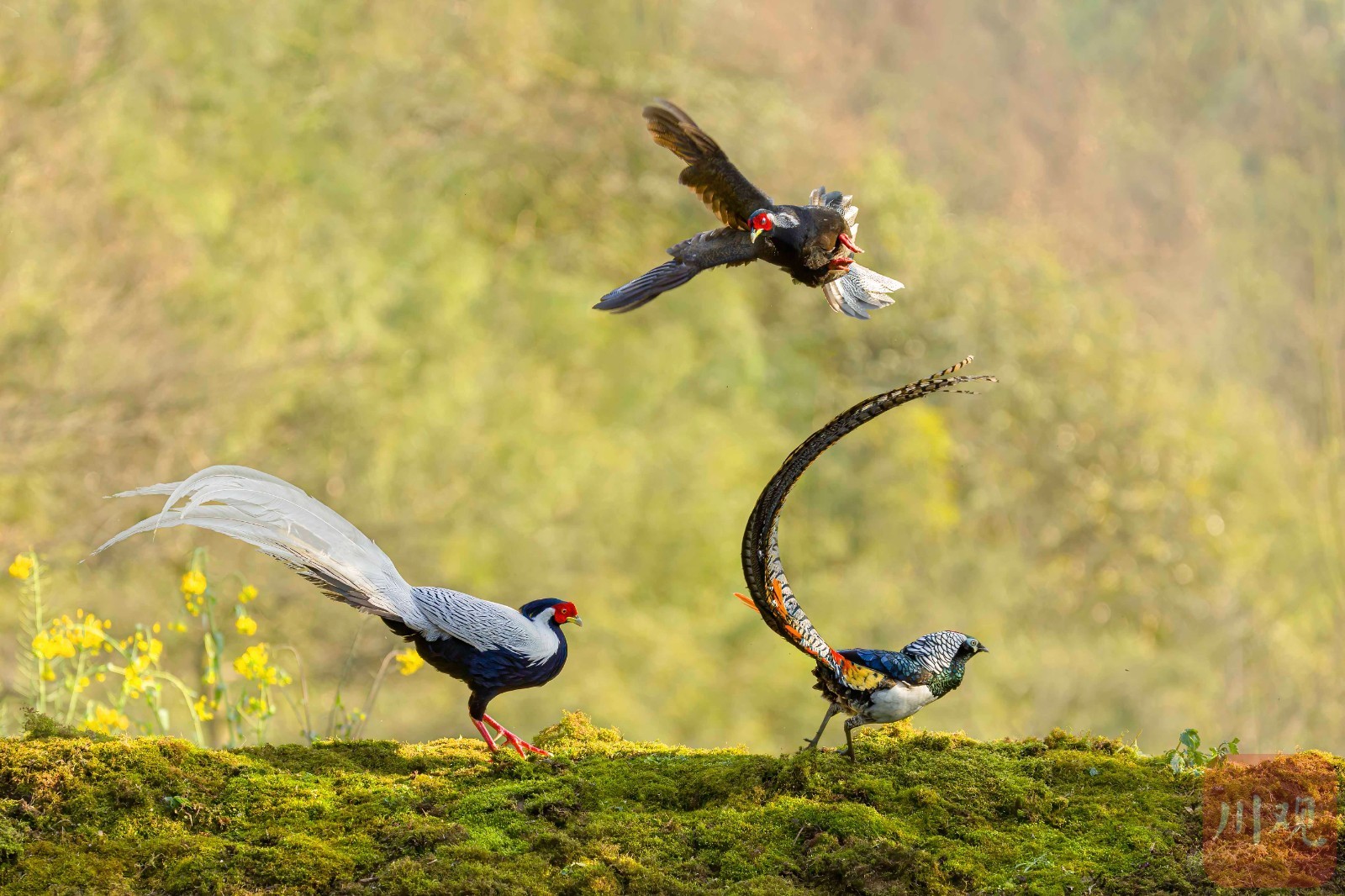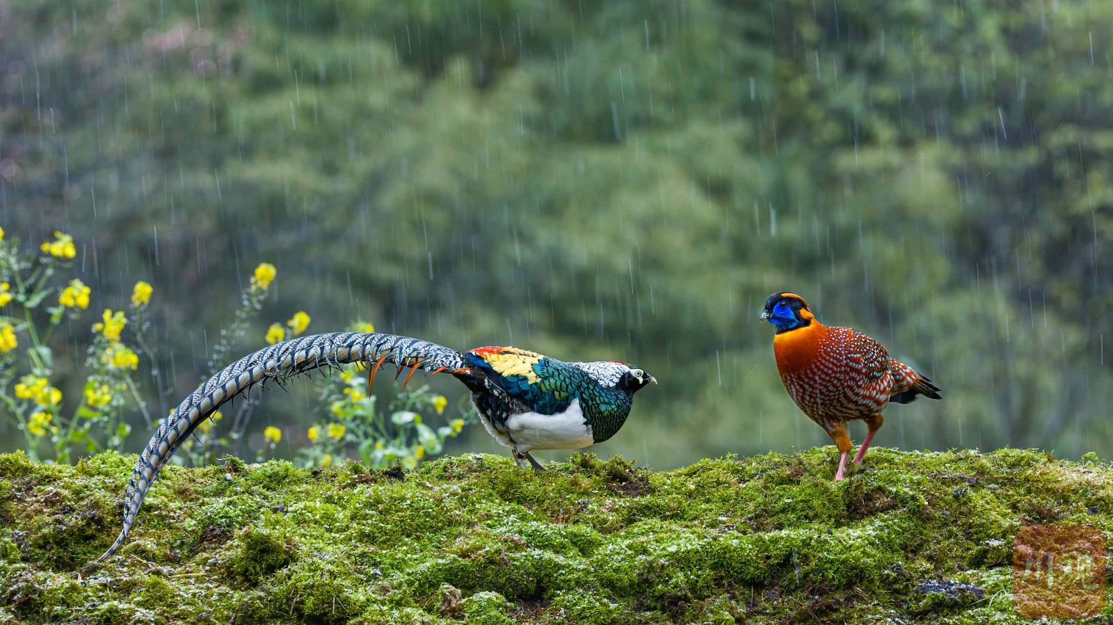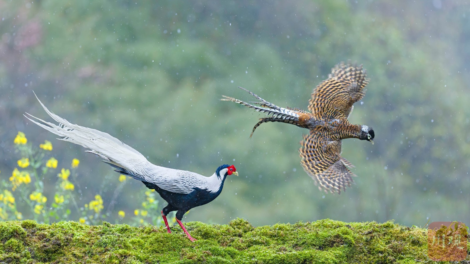 红腹角雉(雄)与白腹锦鸡(亚成雄)