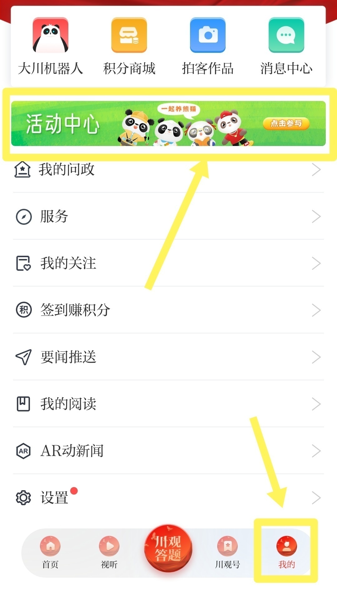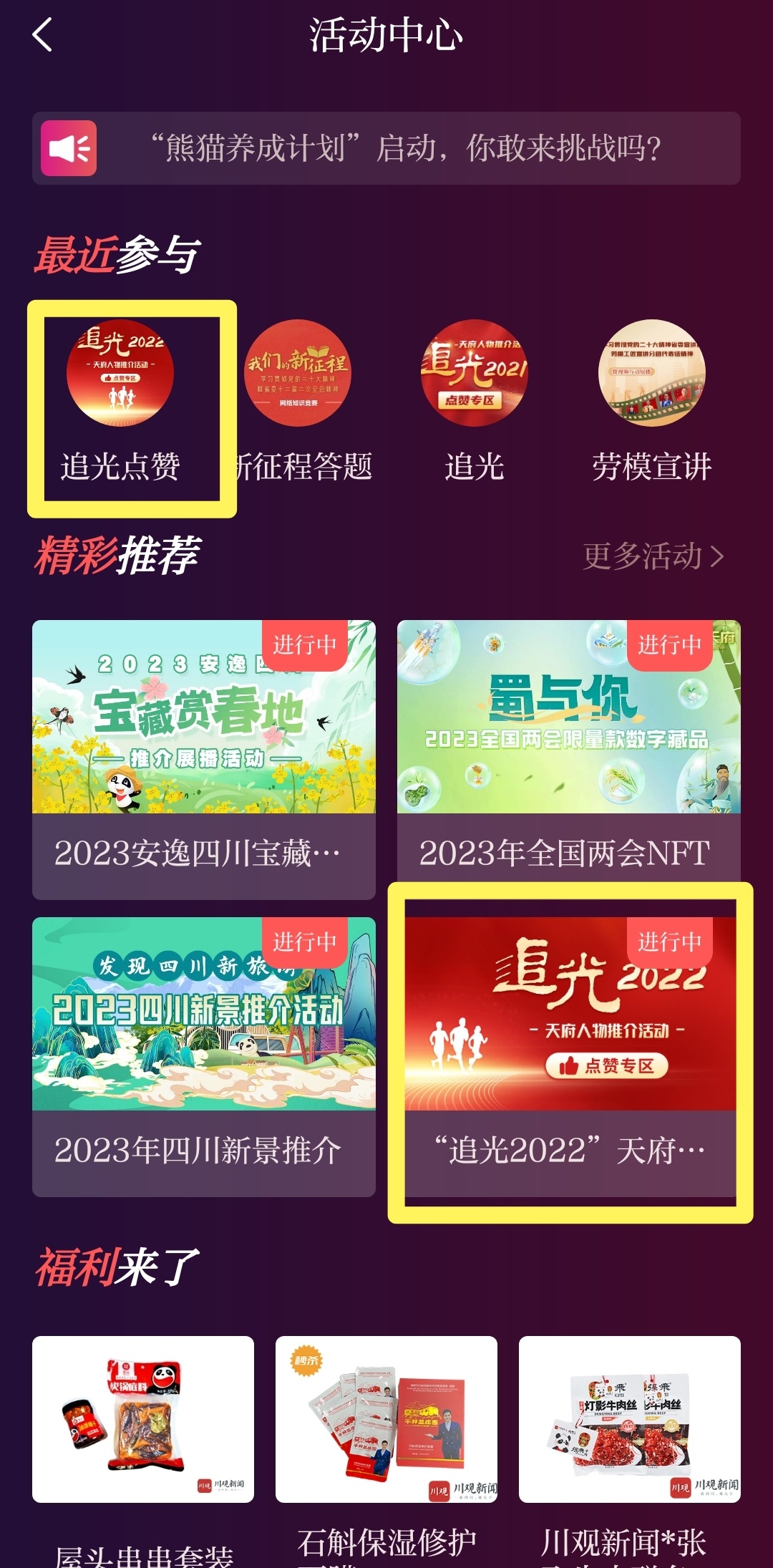方式二:在川观新闻首页“我的”版块点击“活动中心”,找到“追光2022”点赞通道参与