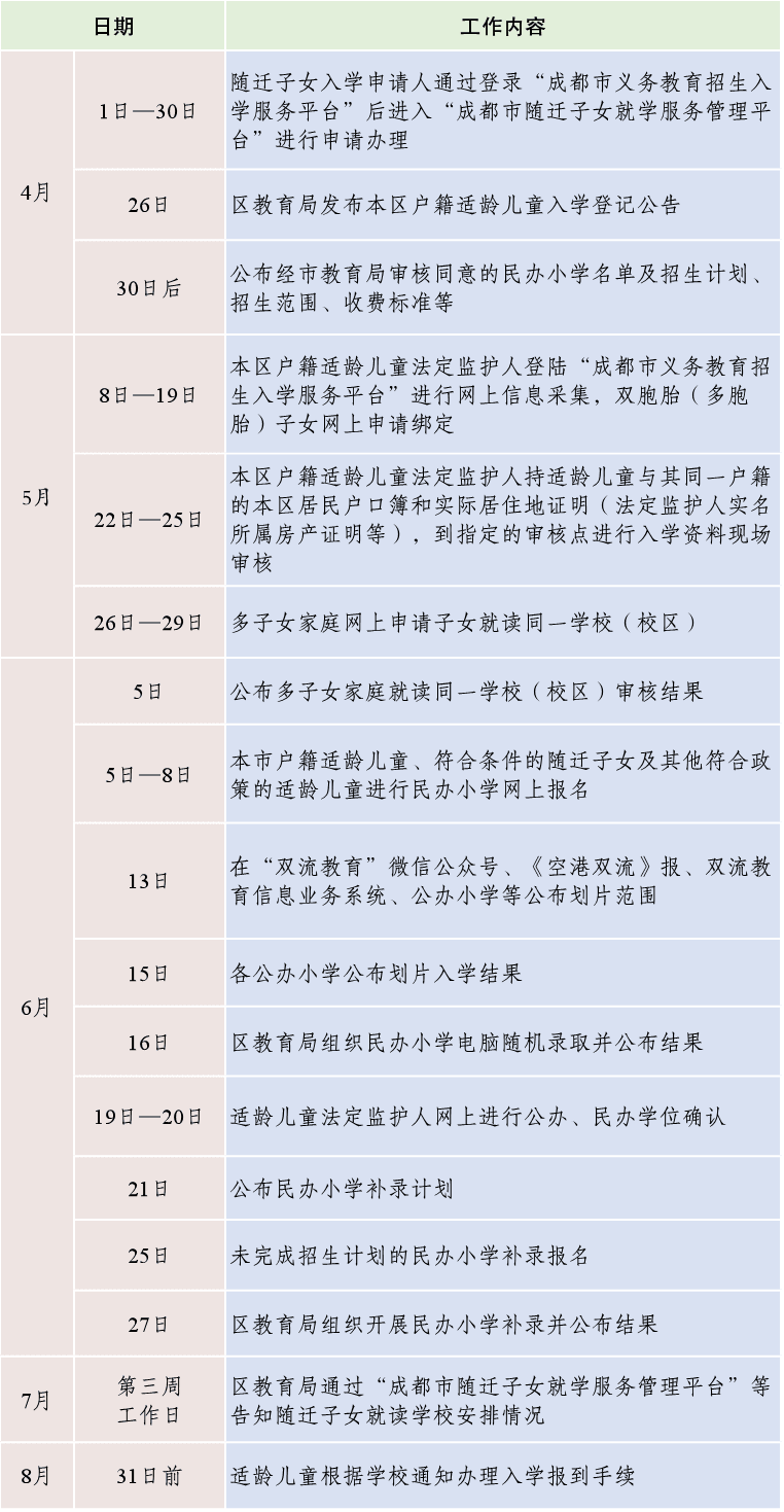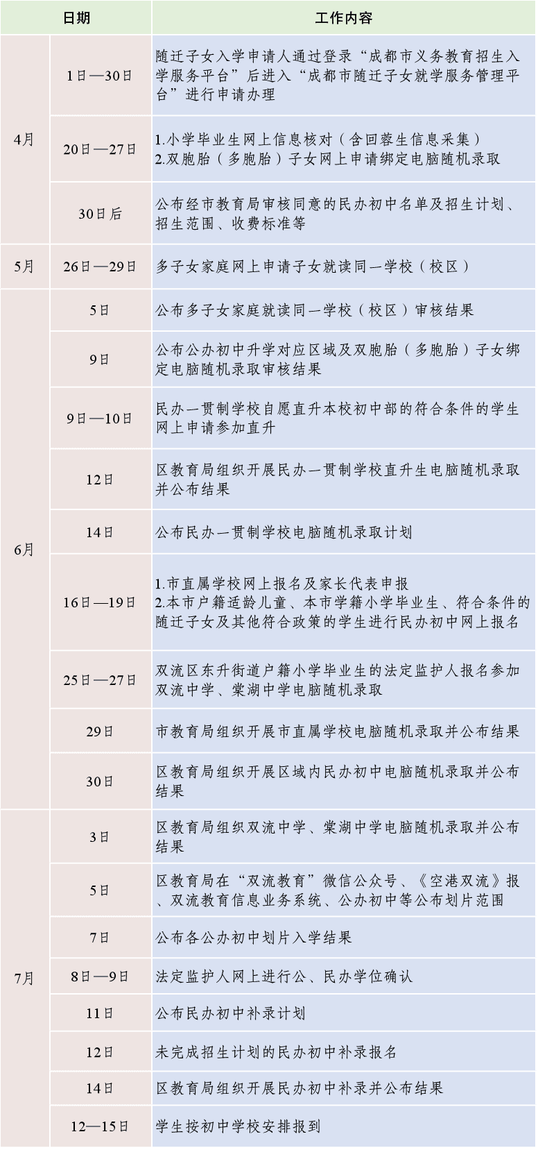 本区小学毕业生登录“成都市义务教育招生入学服务平台”进行小学毕业信息核对;回蓉生进行信息采集;双胞胎(多胞胎)子女网上申请绑定电脑随机录取。