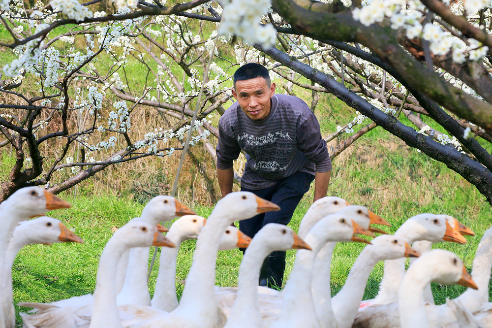 3月16日,在屏山县锦屏镇,漫山遍野的茵红李花争相开放,林下放养的浙东白鹅畅游其间,宛如一幅清丽的水墨画。茵红李林下养起鹅来,这是屏山县借力东西部扶贫协作,创新推出的茵红李立体循环农业新模式。