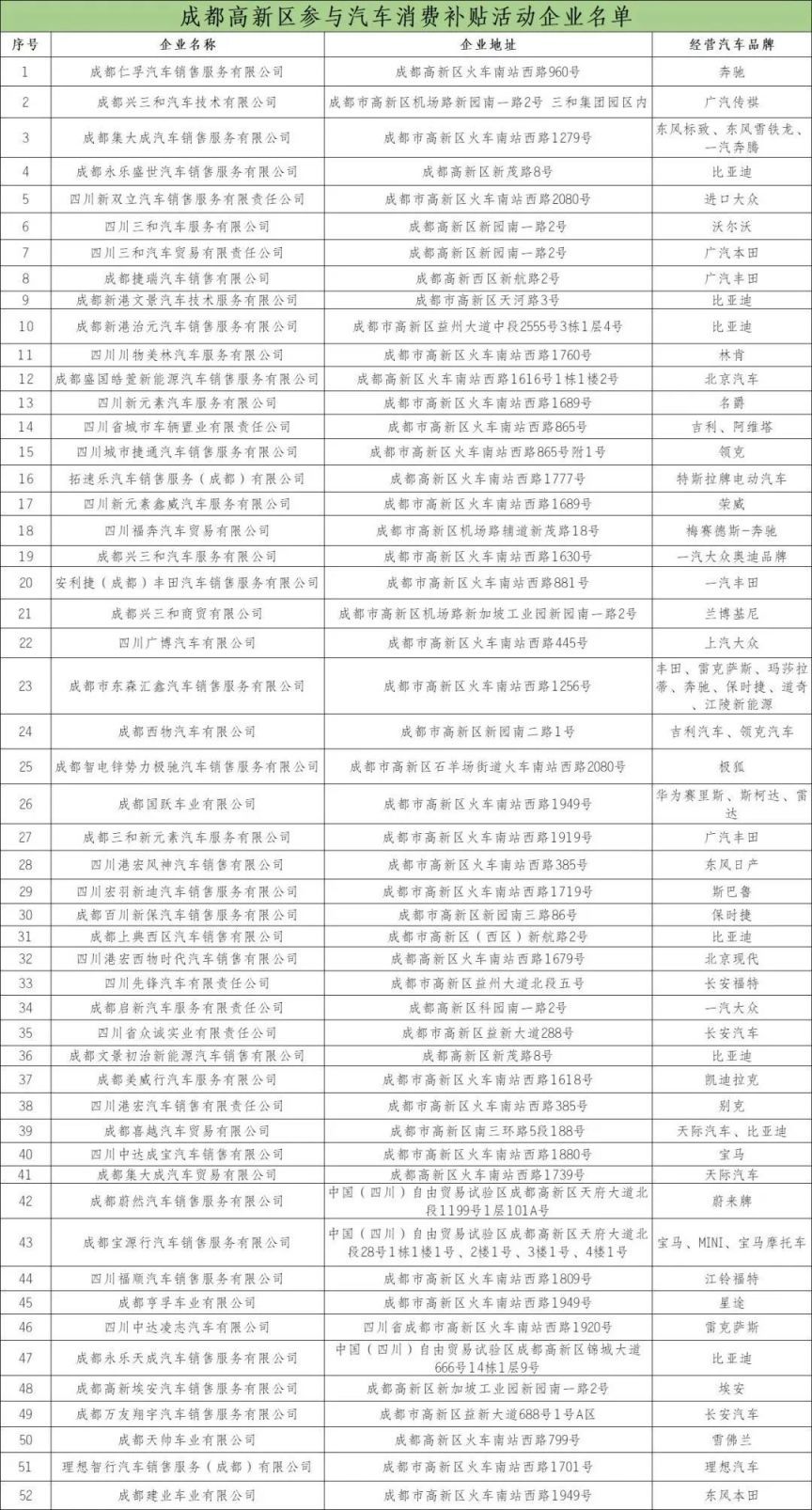 成都高新区参与汽车消费补贴活动企业名单