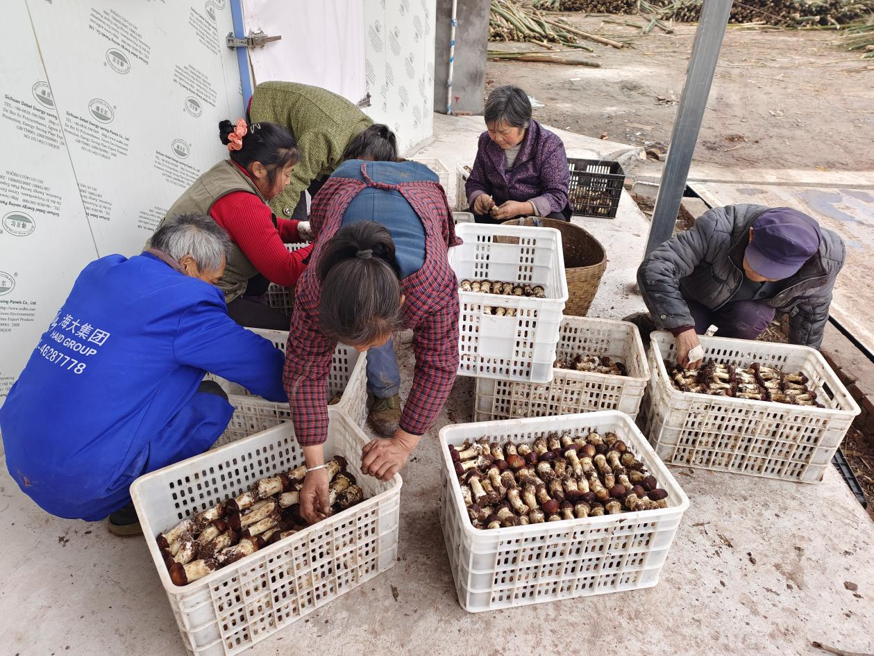 村民们正在整理采收回来的大球盖菇。