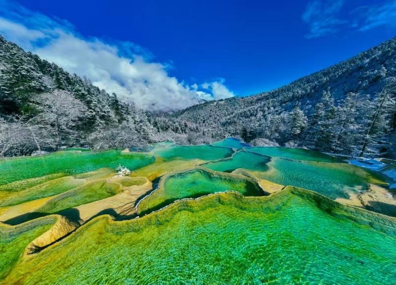 这里有世界规模最大钙华彩池群——黄龙,大自然的鬼斧神工造就“人间瑶池”,五彩色泽令人惊叹。
