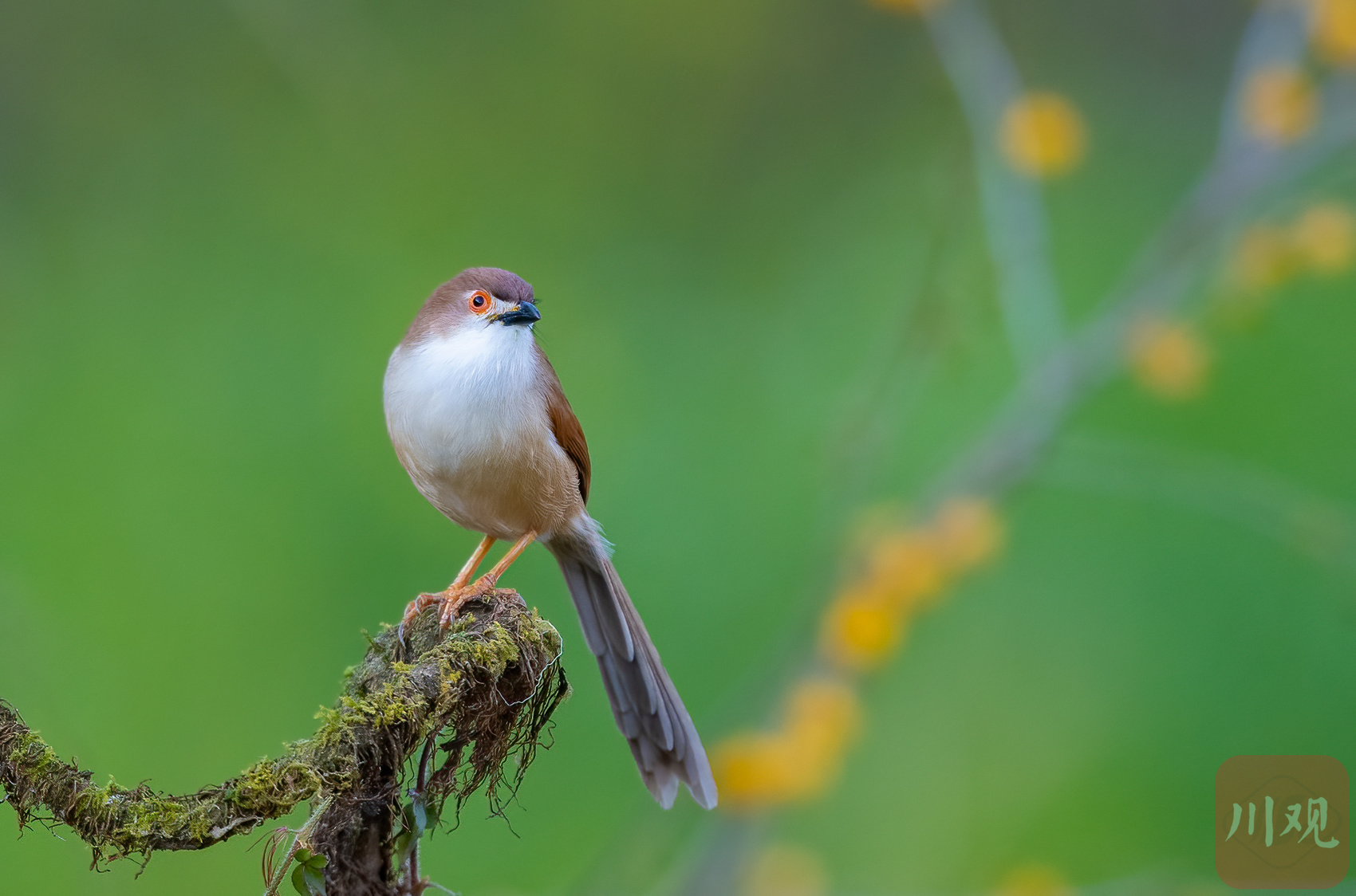 金眼鹛雀,雀形目鸦雀科鹛雀属的鸟类。体型略大(19厘米)棕褐色鹛。习性:于繁殖期外结小群活动。藏隐于灌丛及高草丛。常于地面取食。扎入覆盖处前立于高草秆上鸣叫。