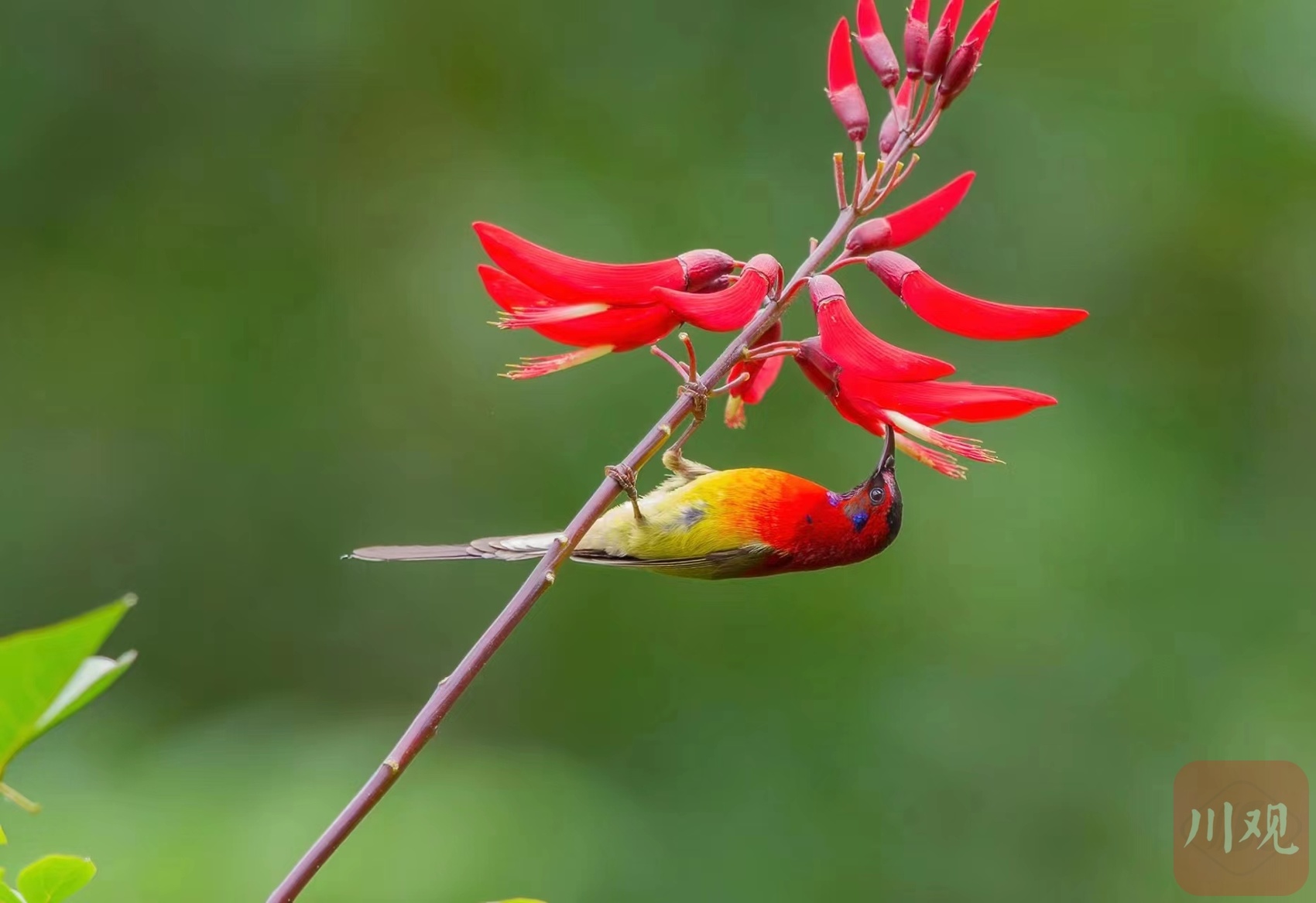 蓝喉太阳鸟,是雀形目太阳鸟科太阳鸟属的鸟类。雄鸟前额至后颈、耳后块斑、颏、喉绿色而具金属光泽,眼先、颊、头侧黑色,颈侧和背暗红色。蓝喉太阳鸟主要以花蜜为食,也吃昆虫等动物性食物。 常单独或成对活动,也见3-5只或10多只成群,彼此保持一定距离。