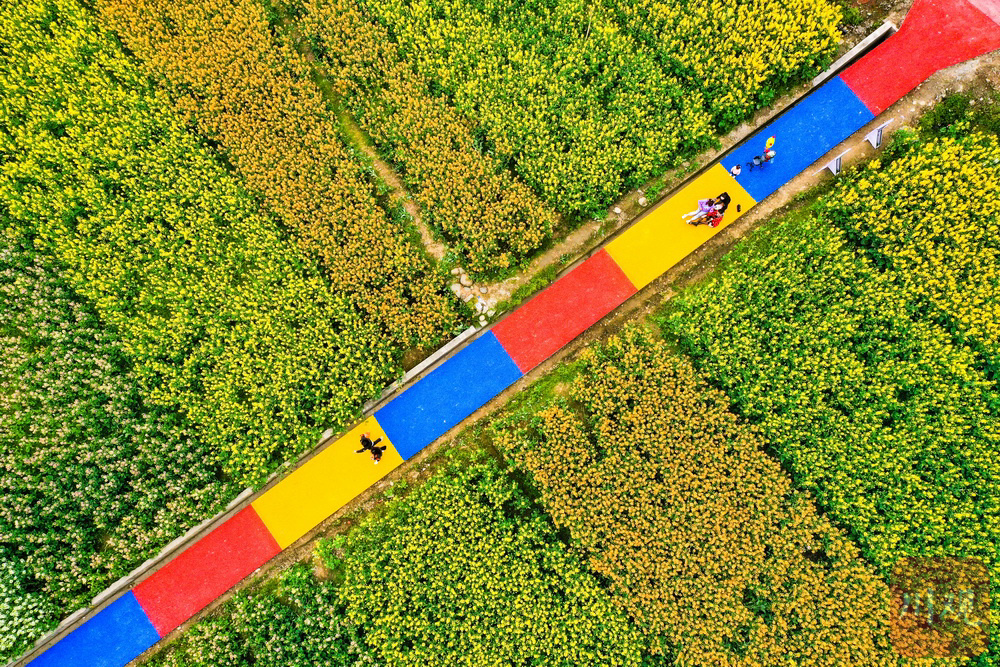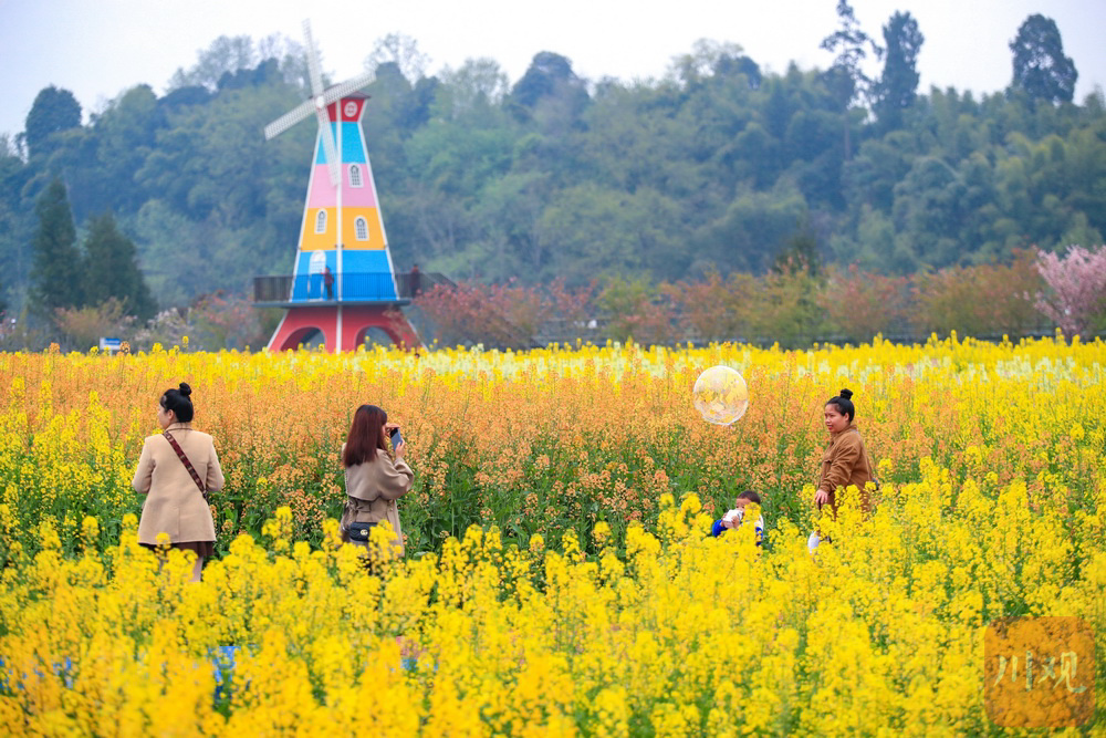 活动后,与会嘉宾还一同观赏了油菜花田。在芦山县粮经复合园粮油(思延)示范基地,彩色油菜花缤纷盛开,游客三五成群徜徉花海。基地引进紫色、桃红、深粉、橙色、白色5种油菜品种,利用不同的彩色图案和色块打造出极具特色的油菜花地景观。