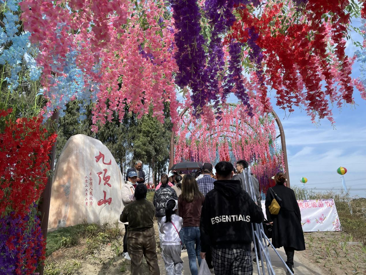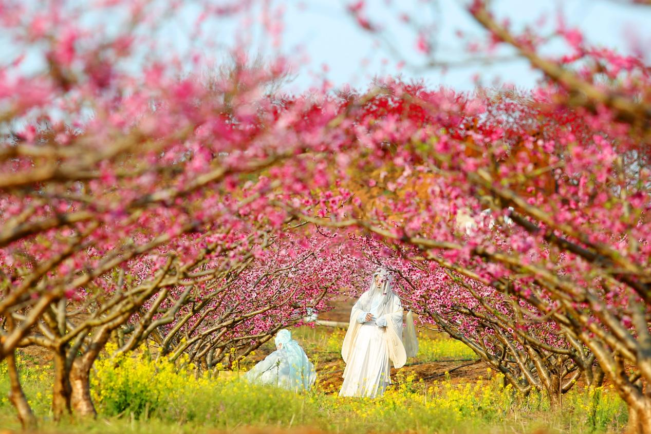 再往深处去便是“九顶桃花源”,这是园区内的游览重头戏。这里种植1200余亩特色水果,有水蜜桃、脆桃等10余种桃树。身处桃花源春可观花、夏可摘果、秋可取胶、冬可饮酒,让游客享受四季不同的游玩乐趣。开幕式当日,九顶桃花源内汉服打卡、网红拍照打卡、赏花打卡的游客们络绎不绝。