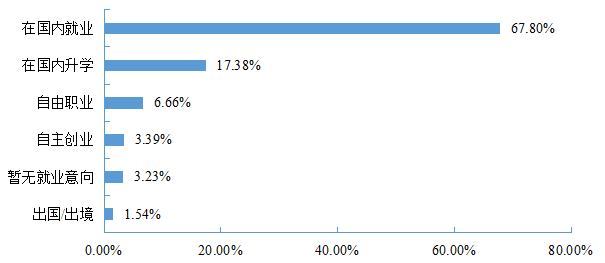 毕业生就业意向前三位选择分别为在国内就业(67.80%)、在国内升学(17.38%)和自由职业(6.66%)。
