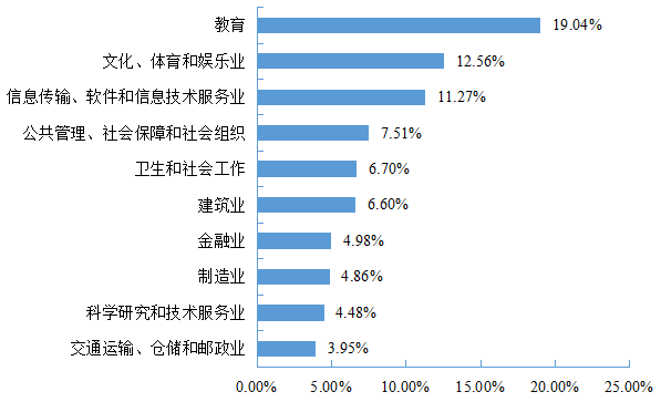 毕业生意向就业行业前三位选择分别为教育行业(19.04%),文化、体育和娱乐业(12.56%),信息传输、软件和信息技术服务业(11.27%)。