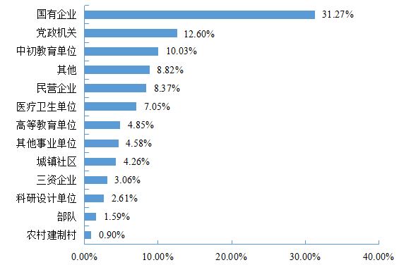 毕业生意向就业单位性质前三位选择分别为国有企业(31.27%)、党政机关(12.60%)和中初教育单位(10.03%)。