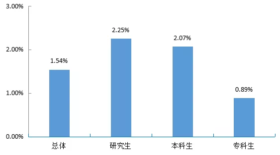 毕业生意向出国(境)深造总体比例为1.54%。其中,研究生意向出国(境)深造比例(2.25%)高于本科生(2.07%)和专科生(0.89%)。