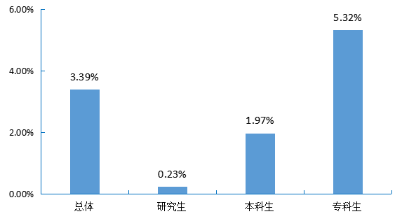 毕业生的意向创业总体比例为3.39%。其中,专科生意向创业比例(5.32%)明显高于研究生(0.23%)和本科生(1.97%)。
