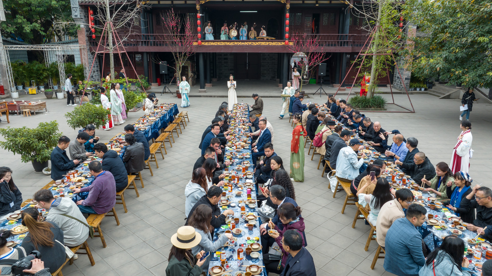 诗人们在洛带古镇体验客家特色坝坝宴。
