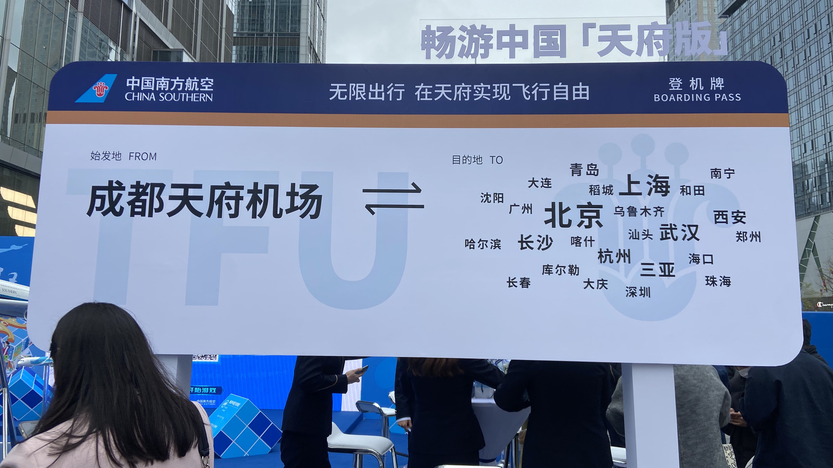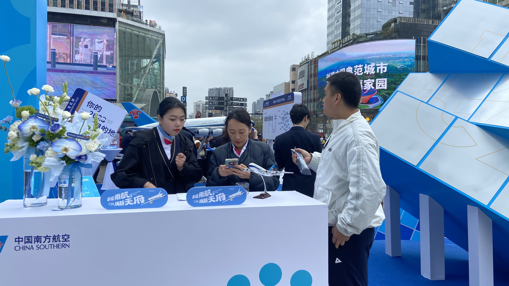 3月18日,2023年南方航空天府机场转场体验展在成都春熙路步行街举行。记者从现场获悉,自3月26日夏秋航季开始,南航涉及成都部分航班将正式转场至成都天府国际机场,同时保留成都至广州、成都至北京大兴两条商务航线在双流国际机场的持续运营。南航实现双流、天府两场运行。