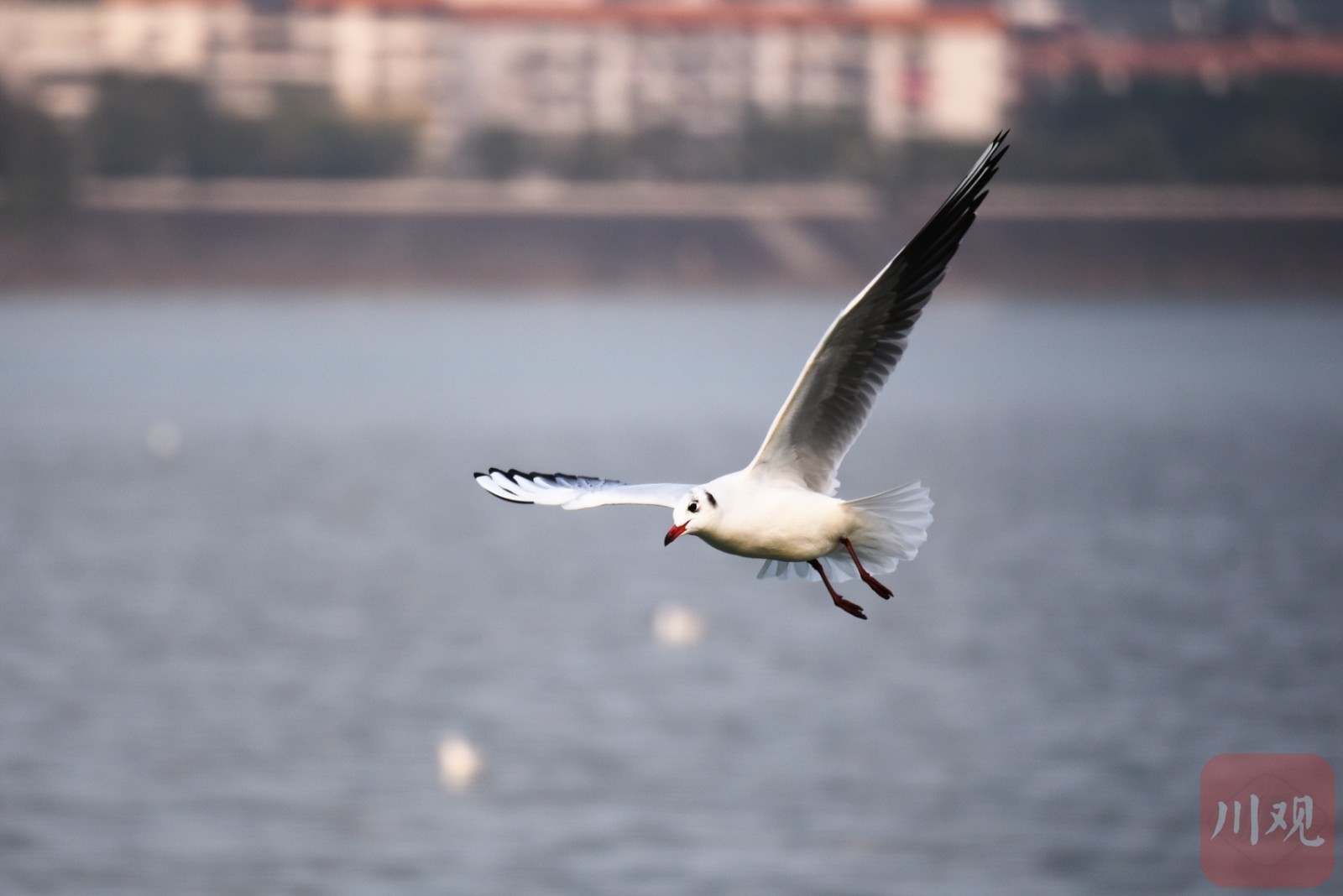 红嘴鸥每年冬季都会到绵阳过冬,这时会有游客在江边给它们投喂各种食物,它们成群结队十分壮观。